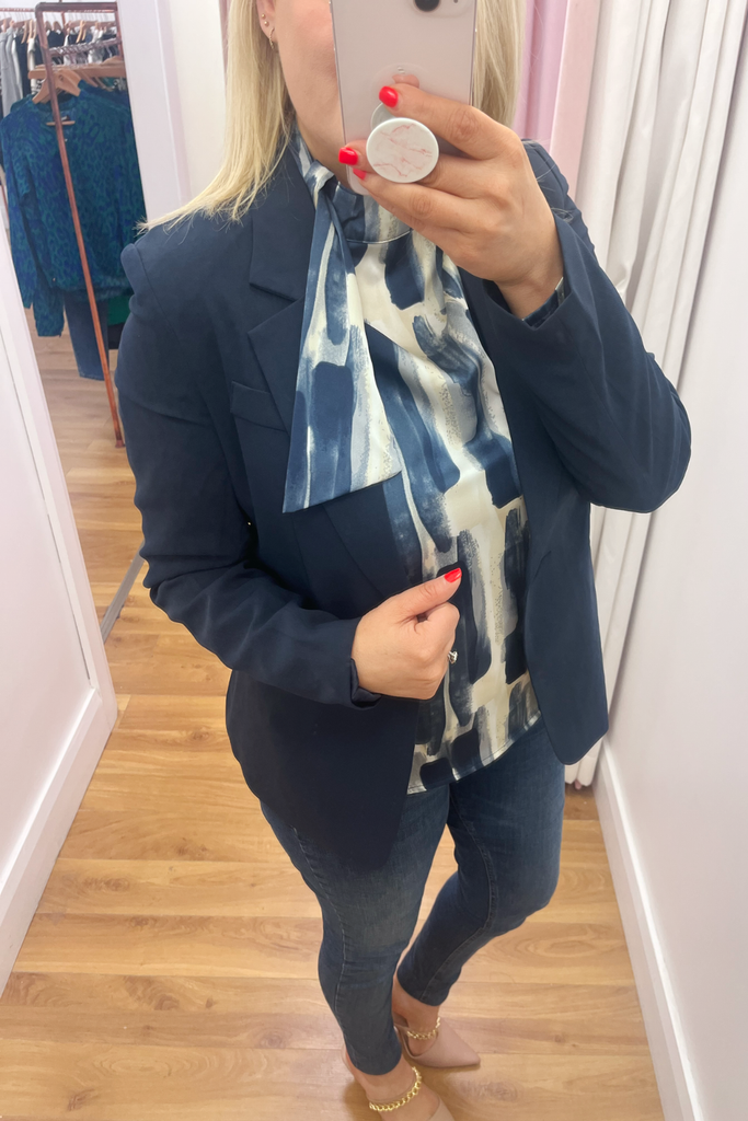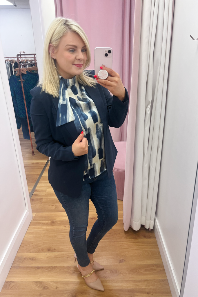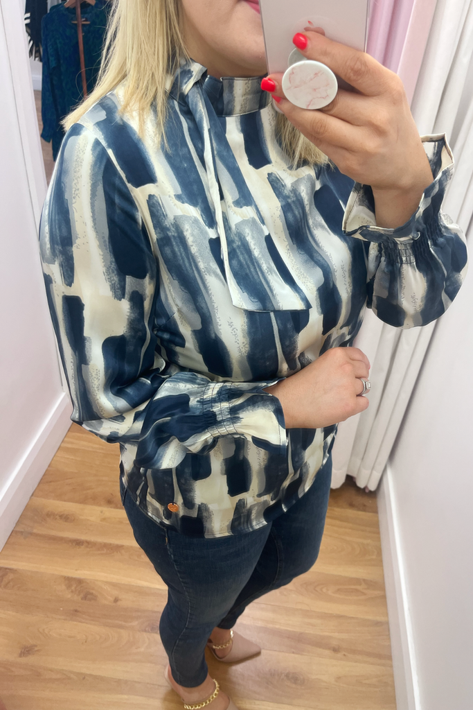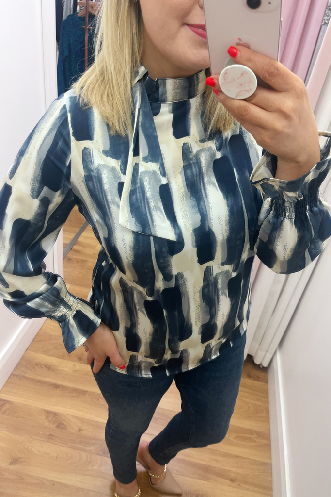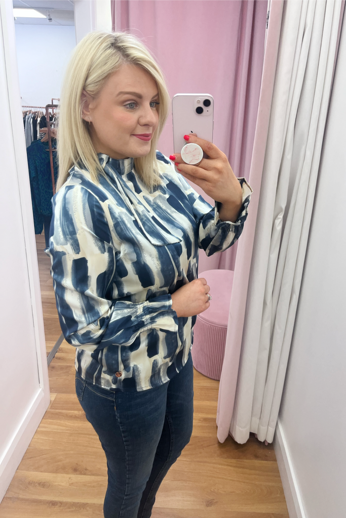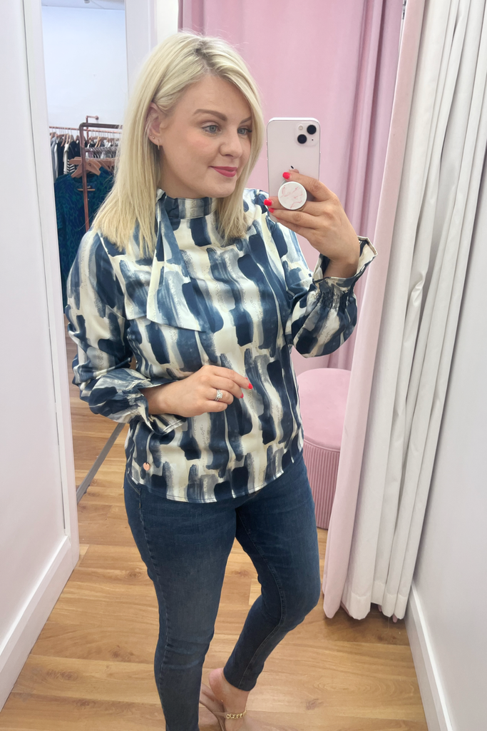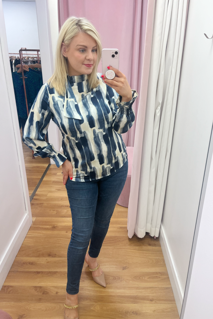 Printed all over in a mix of navy and neutral tones, this blouse is designed in a relaxed silhouette with a raised neckline and long, balloon sleeves with gathered cuffs. Our favourite bit? The gorgeous neck detail which adds a touch of flair to this classic silhouette. This style buttons to the back of the neck. Pair yours with denim or tailored trousers for a bold, classy look