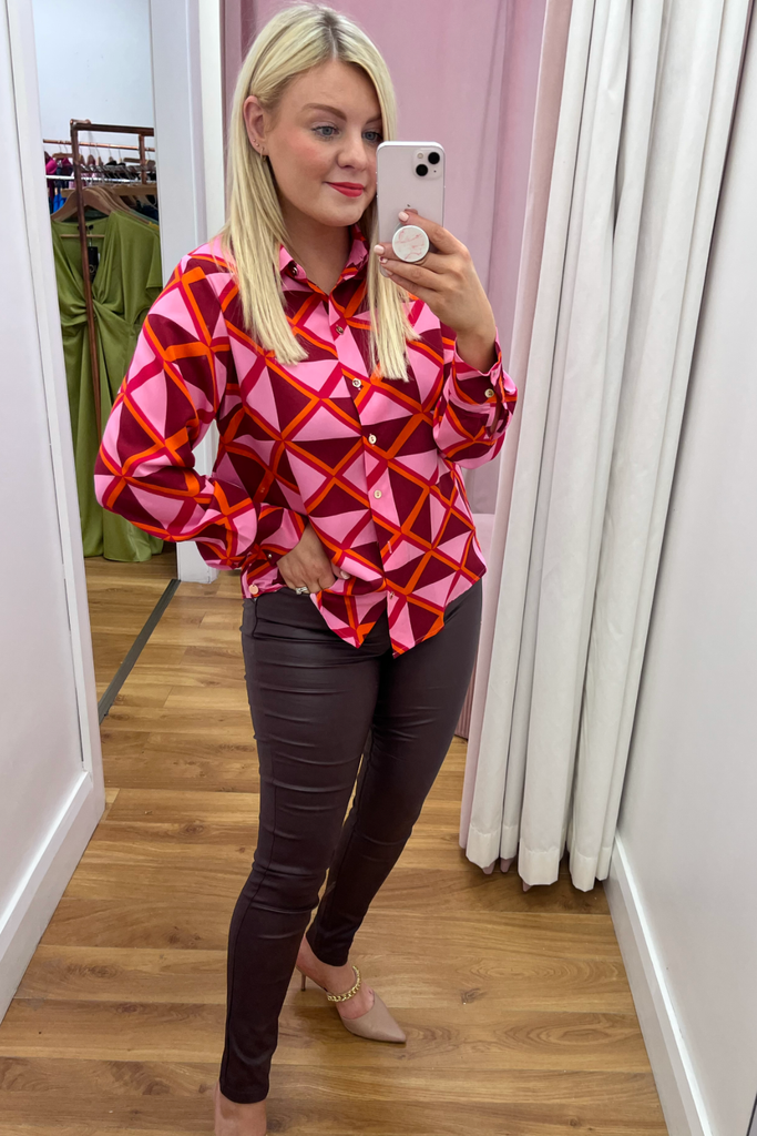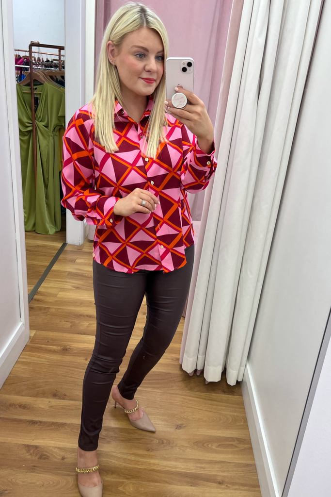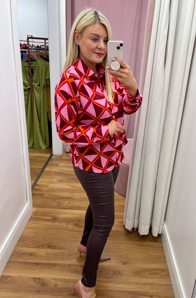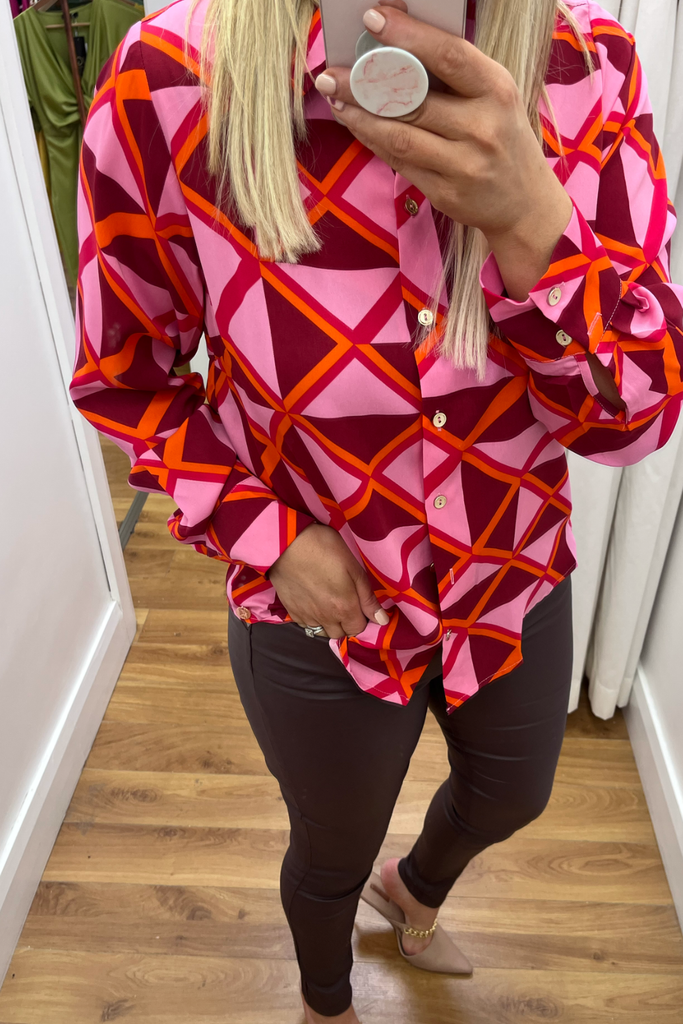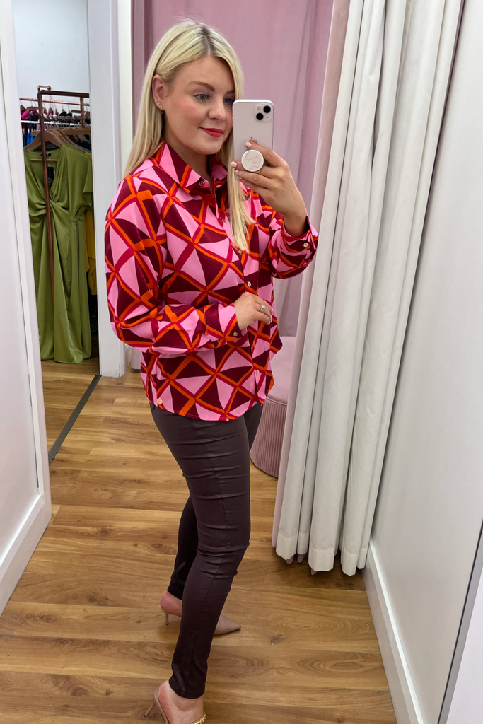 Printed in a striking Pink and Orange abstract print. With collared neckline, buttoned front and full length sleeve with buttoned cuffs. Perfectly paired with our Evelyn coated jeans in Burgundy