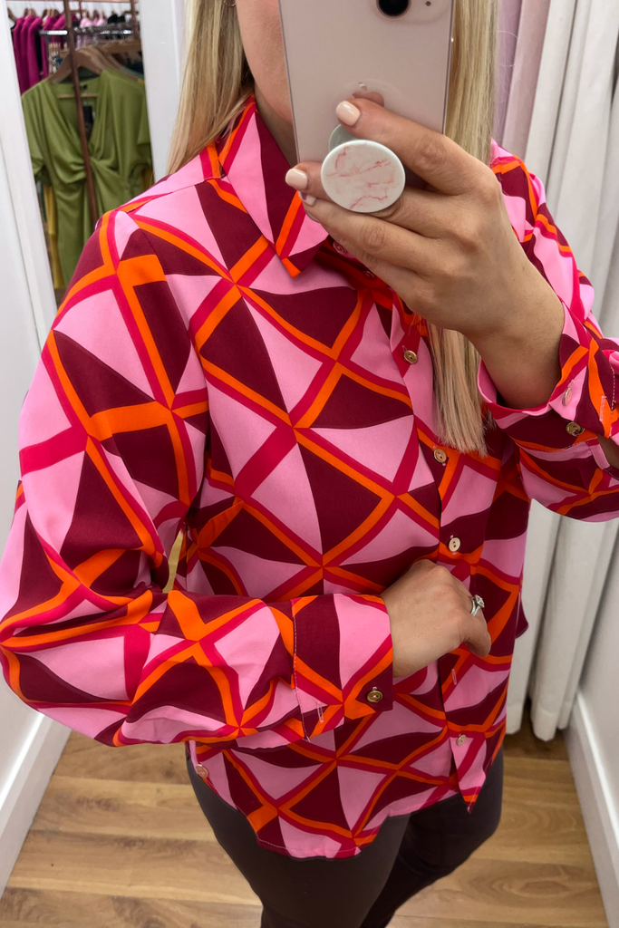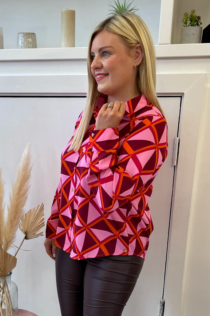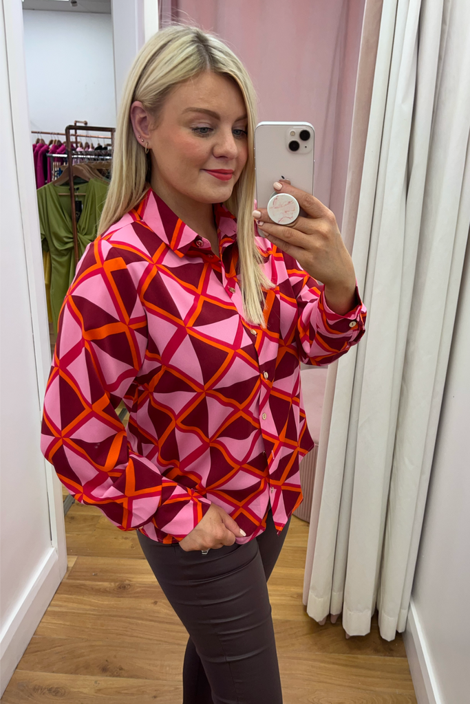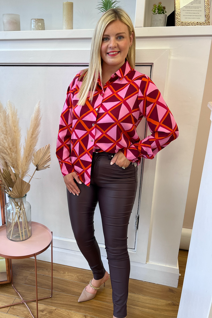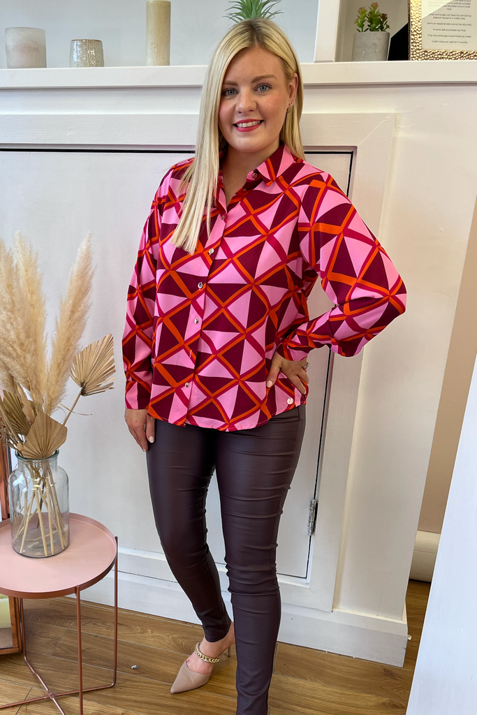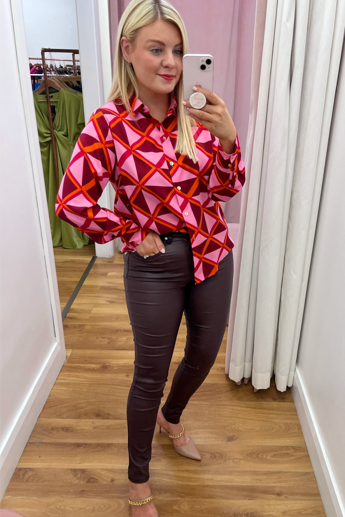 Printed in a striking Pink and Orange abstract print. With collared neckline, buttoned front and full length sleeve with buttoned cuffs. Perfectly paired with our Evelyn coated jeans in Burgundy