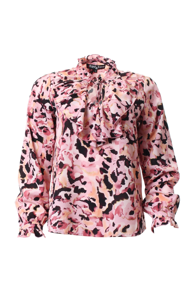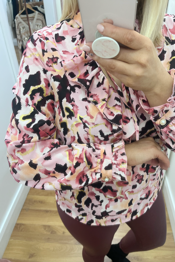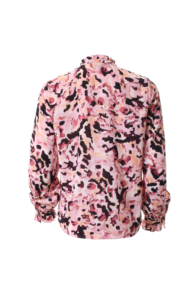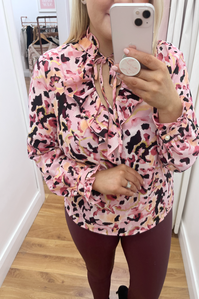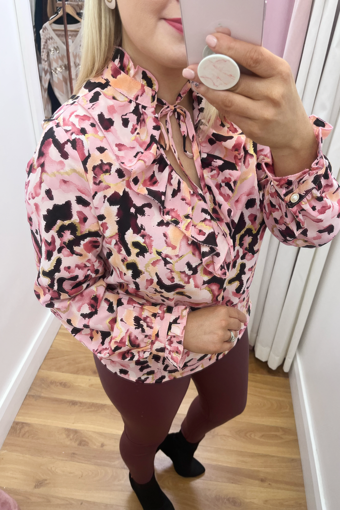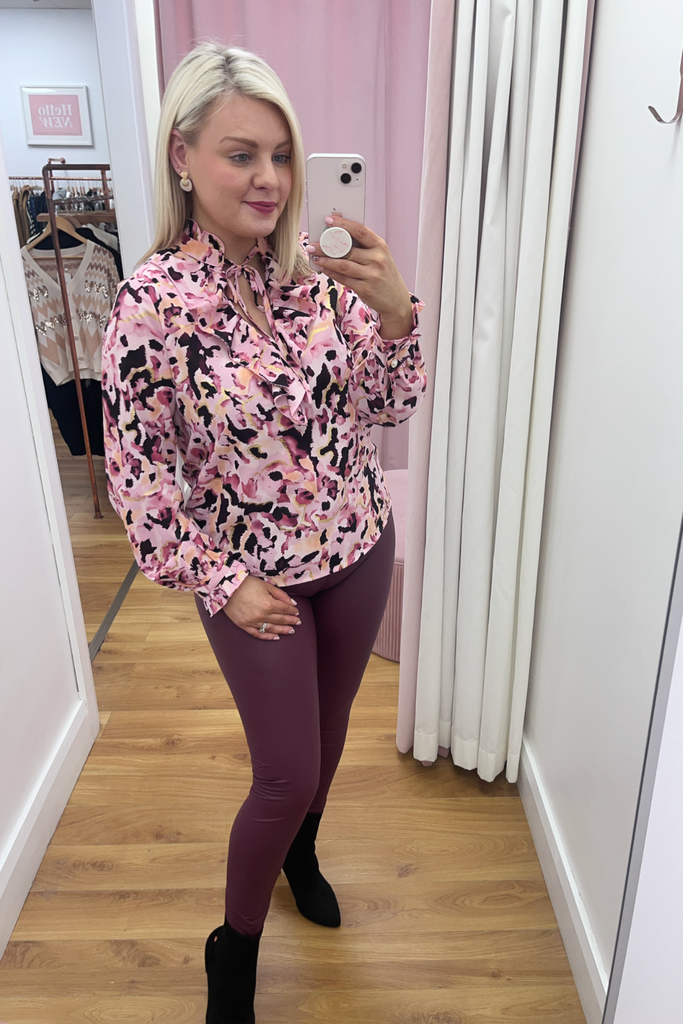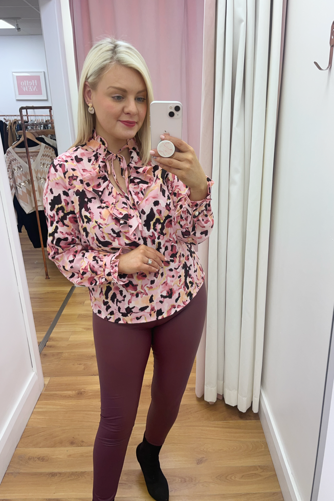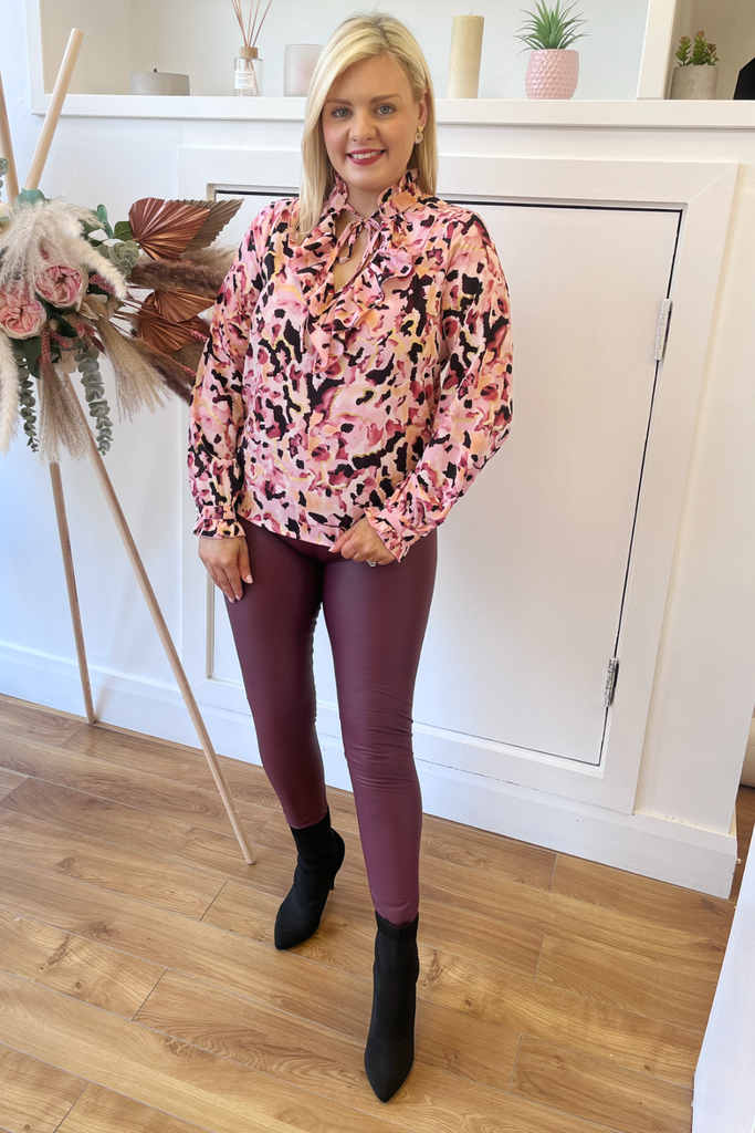 Printed all over with a bold pattern in deep wine, pinks and neutral tones. This blouse is designed in a relaxed silhouette with a gathered V neckline and exaggerated pintuck detailing along the neck opening. With balloon sleeves and pleated buttoned cuffs. A real statement blouse for leggings, jeans or skirts!
