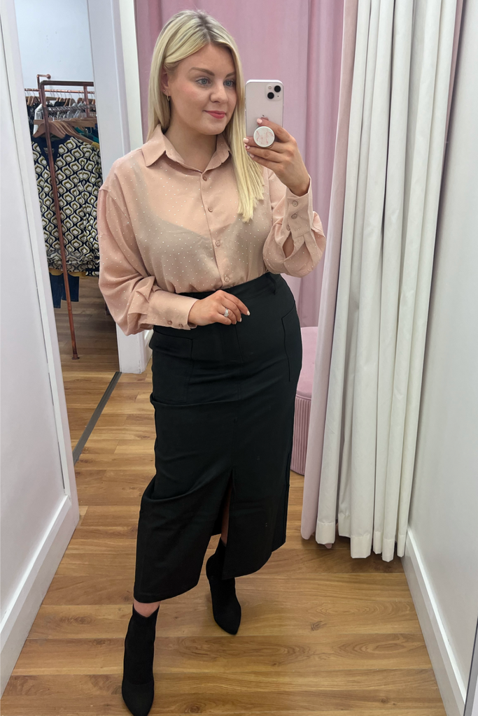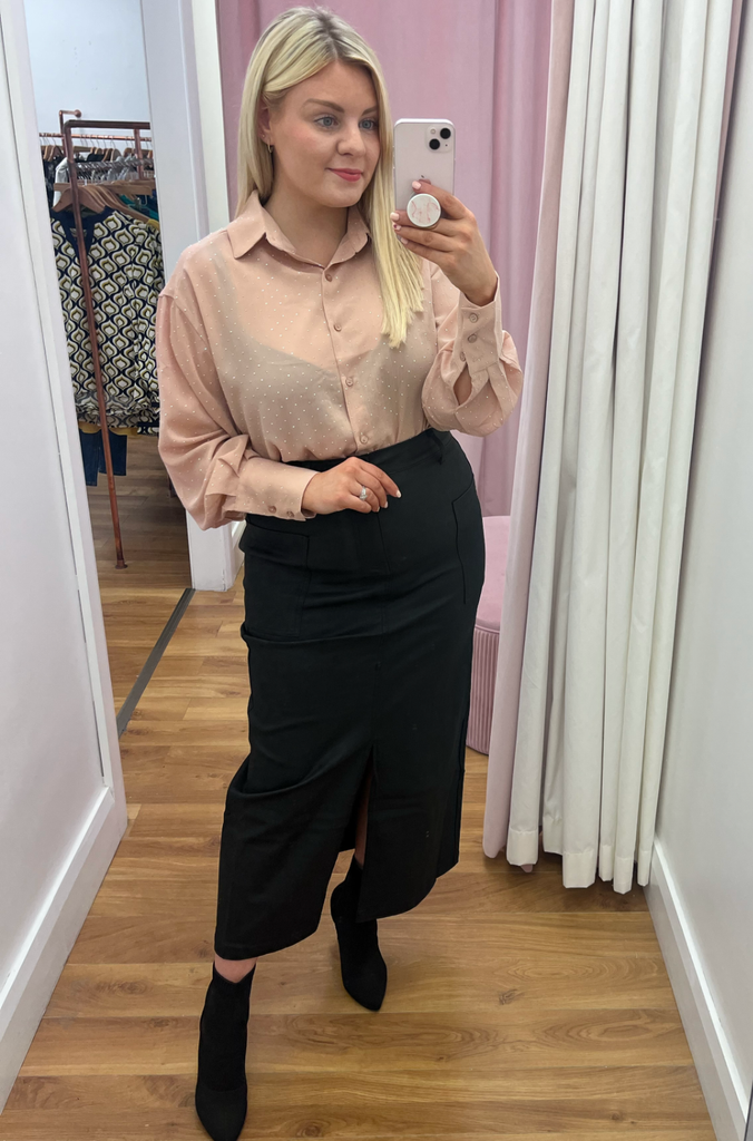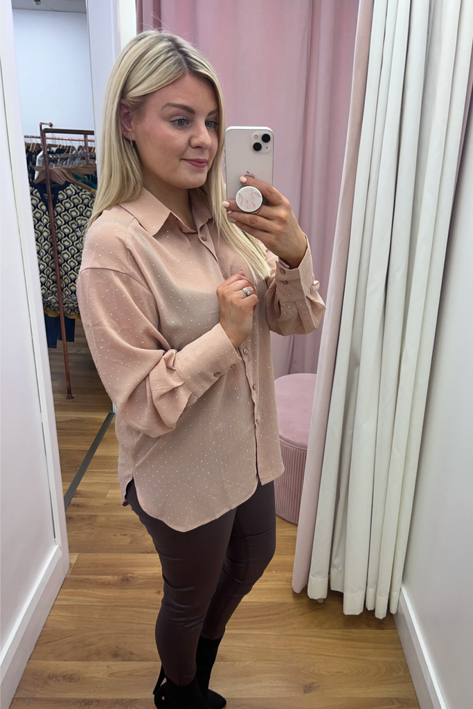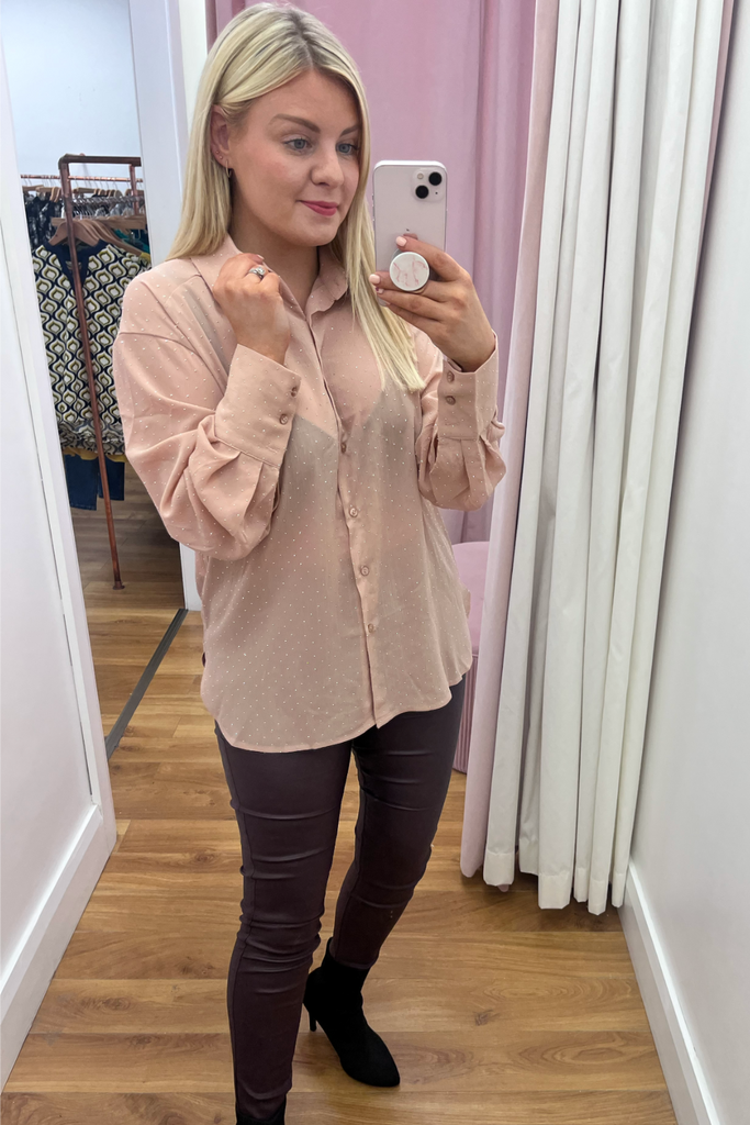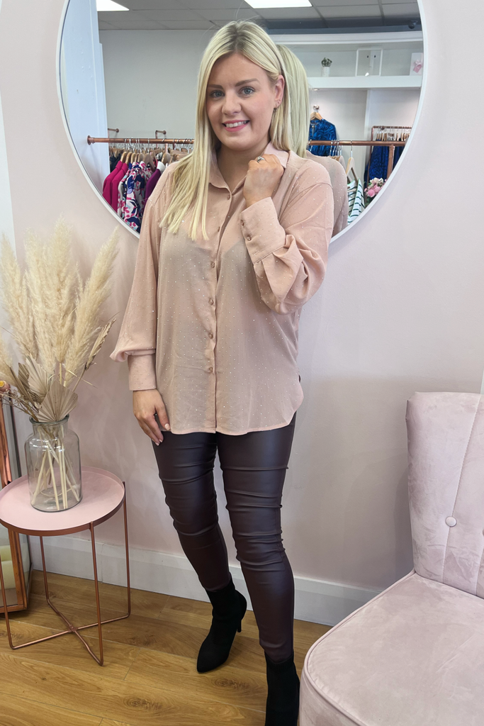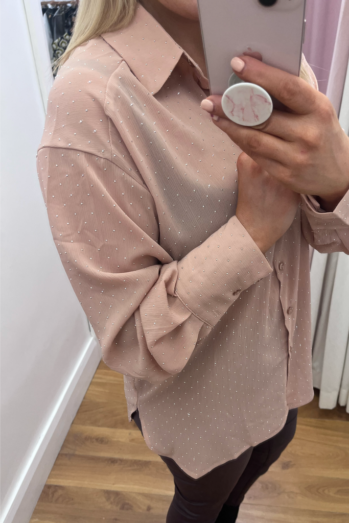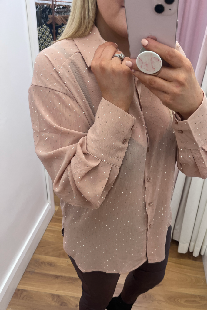 Rose pink buttoned blouse with collar and fitted cuff with buttons. Features delicate stone embellishment throughout. Wear with leggings and jeans, or layer under our fab knitwear! Sheer style