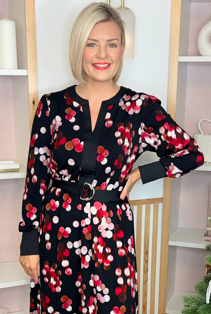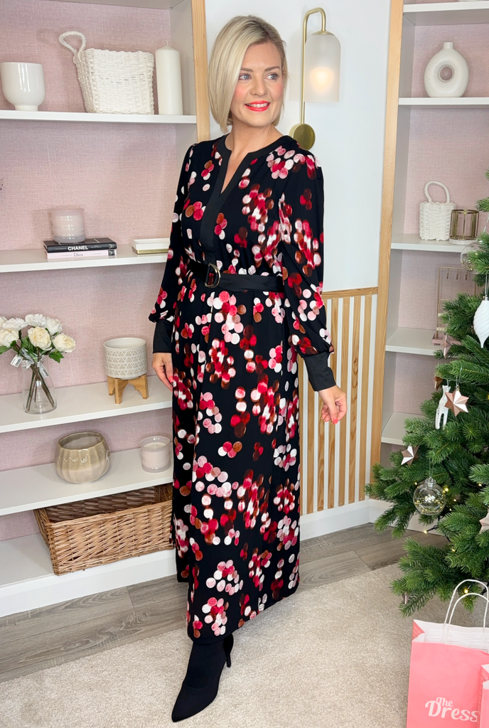 Full length silky feel dress with V-neckline, deep cuff, and material tie belt. This style is unlined