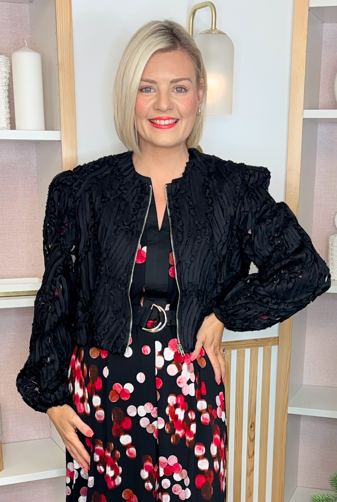 Zipped cropped jacket with beautiful finish. This style is lined to the front, with sheer back and sleeves. Perfect for over dresses and blouses to complete the look!
