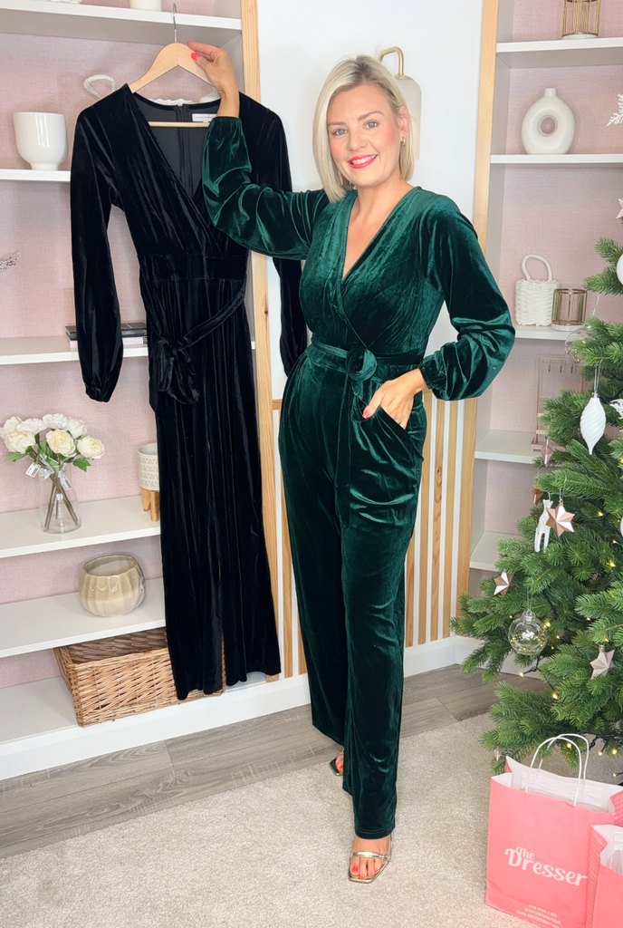 Velvet long sleeve jumpsuit with fitted waist and material tie belt. This style has a wrapped style neckline. And pockets!