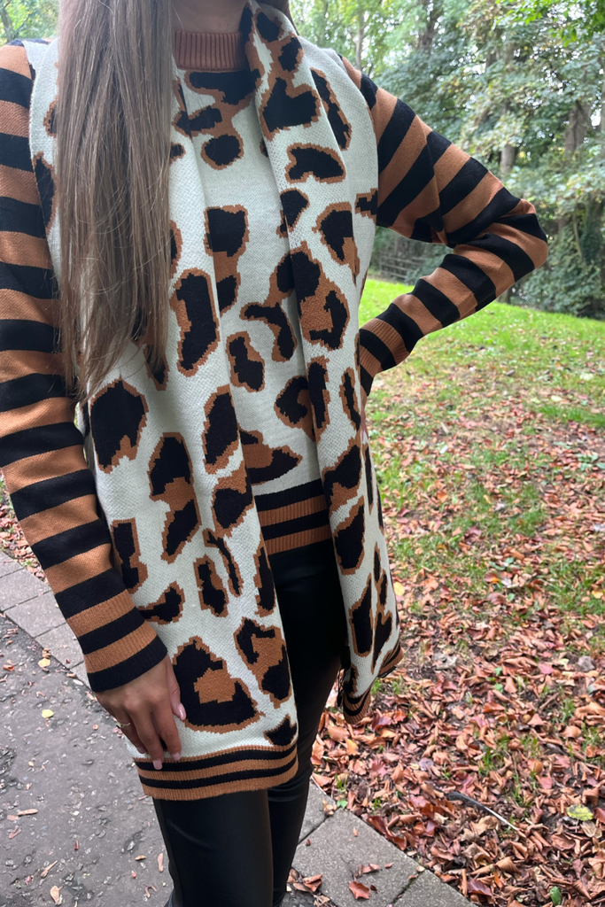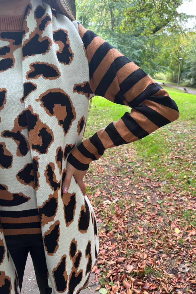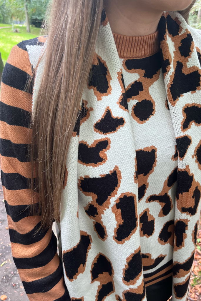 Super soft quilted feel scarf in a mix of white and tan animal print with contrasting stripes. A blanket style scarf to keep you nice and cosy into the cooler months.