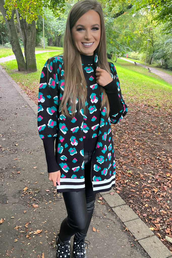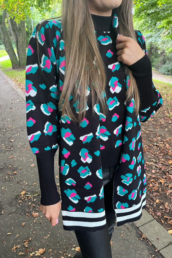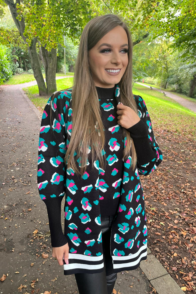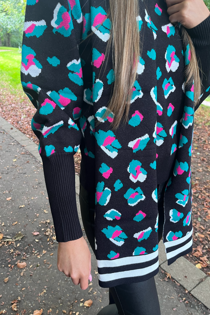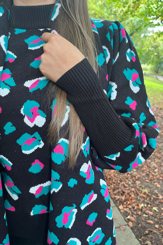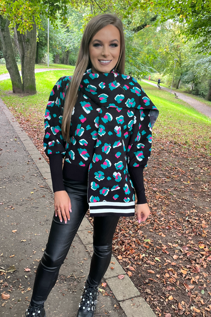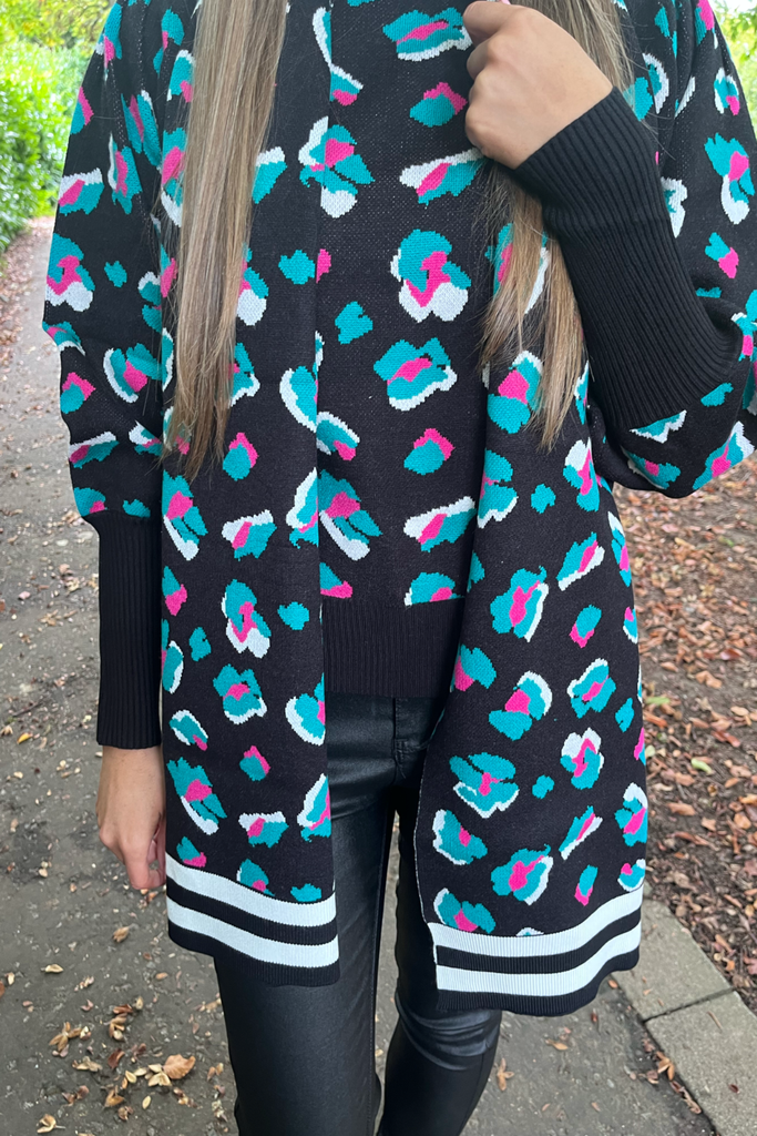 Super soft quilted feel black scarf with a green and pink abstract print with contrasting black and white stripes. A blanket style scarf to keep you nice and cosy into the cooler months.