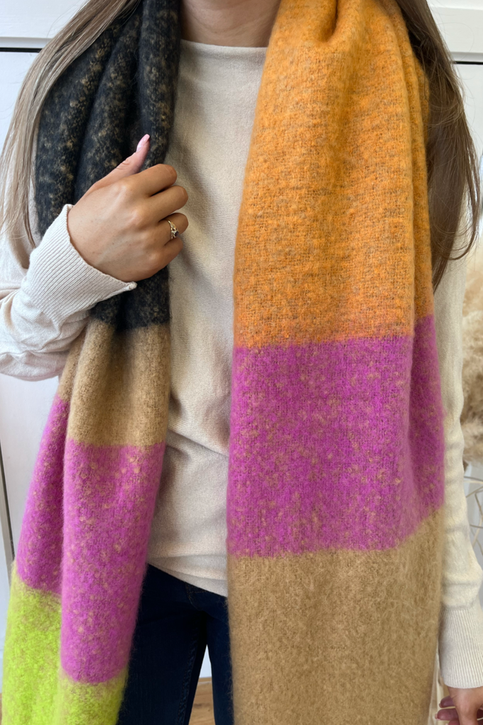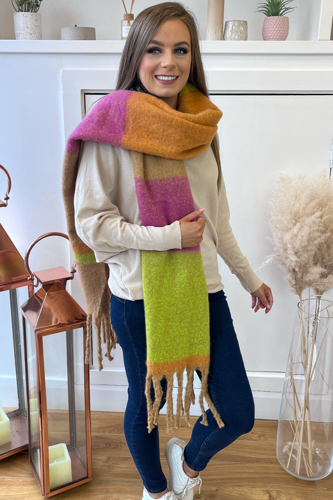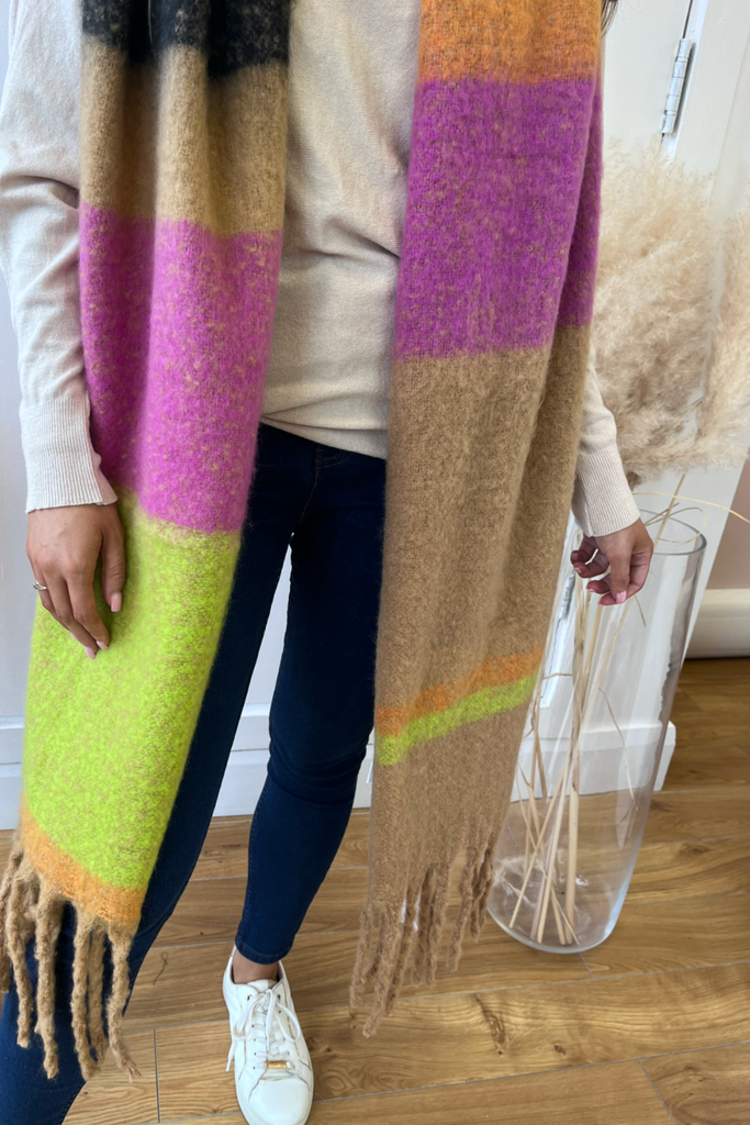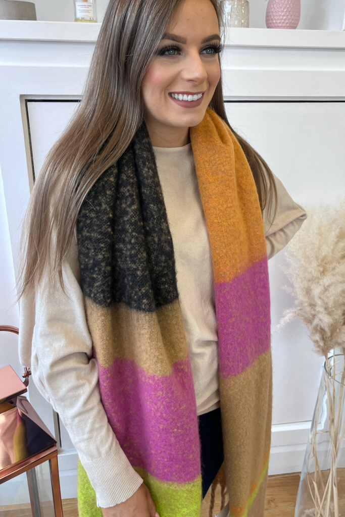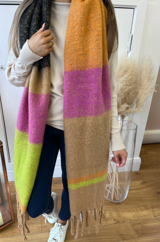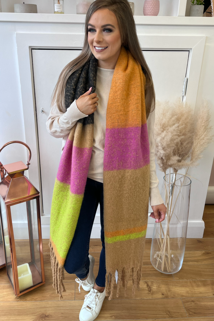 Super soft, blanket scarf in a mix of green, orange, pink, black and tan, with tassels. A blanket style scarf to keep you nice and cosy into the cooler months and with so many colours its so easy to match!