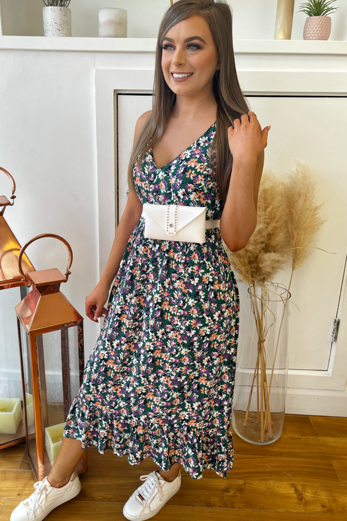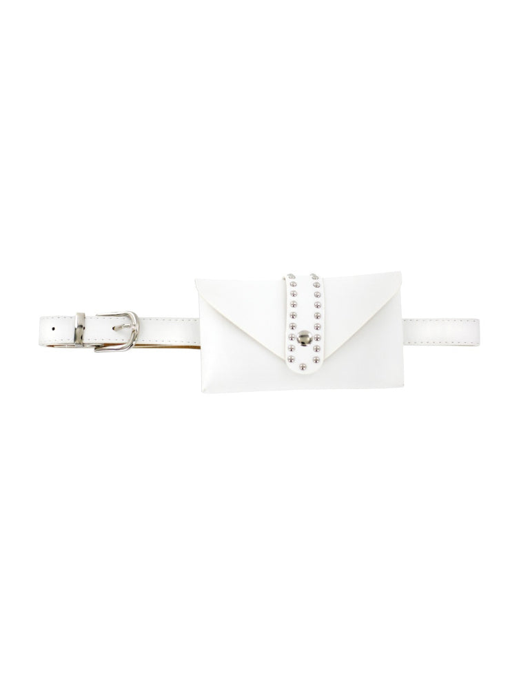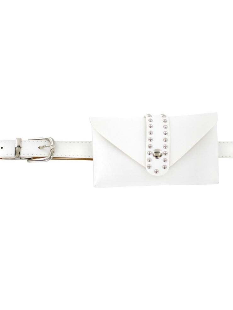 White faux leather belt bag with silver stud details. Our marina belt-bag is the perfect accessory for summer! This 2 in 1 item can be worn as a bumbag or a simply slide the bag off the belt and use them as separates! The versatility of this item allows you to wear it as a bumbag when out and about to keep your items stored away stylishly or take the bag off and wear the belt on its own while having a matching clutch!