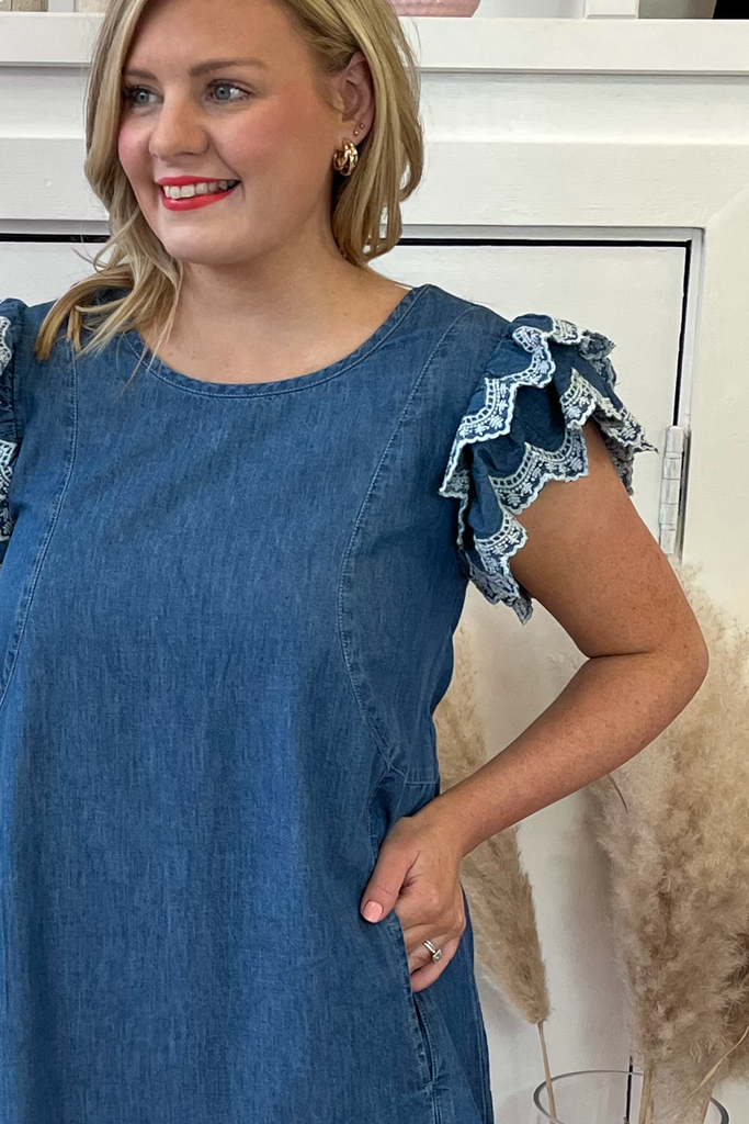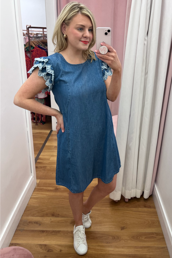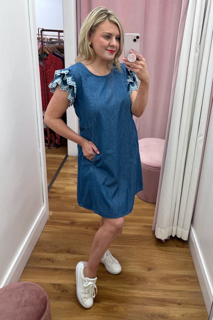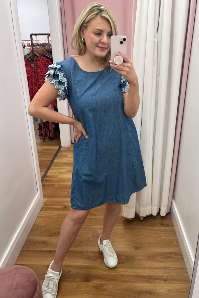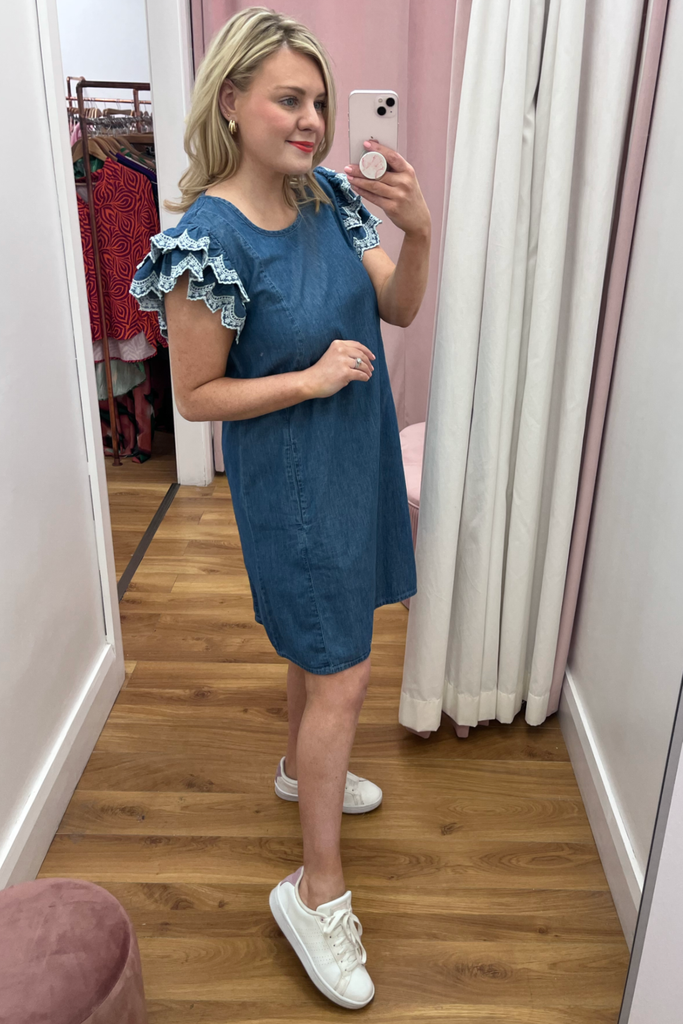 Knee-length shift style denim dress with double cap sleeve with embroidered trim