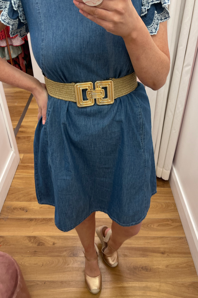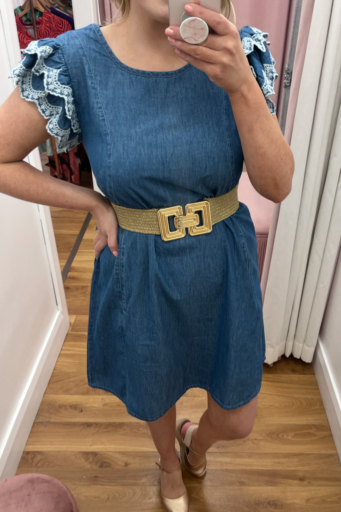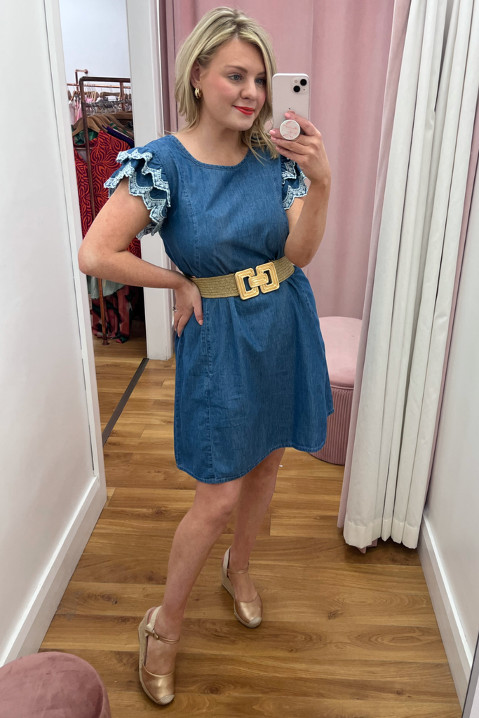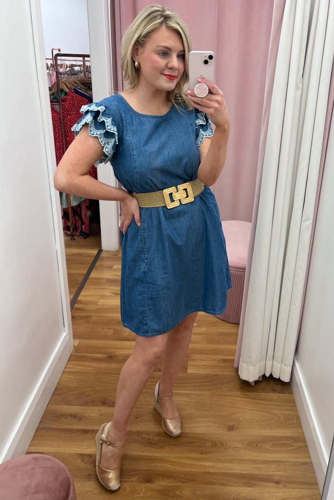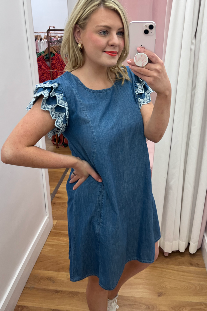 Knee-length shift style denim dress with double cap sleeve with embroidered trim