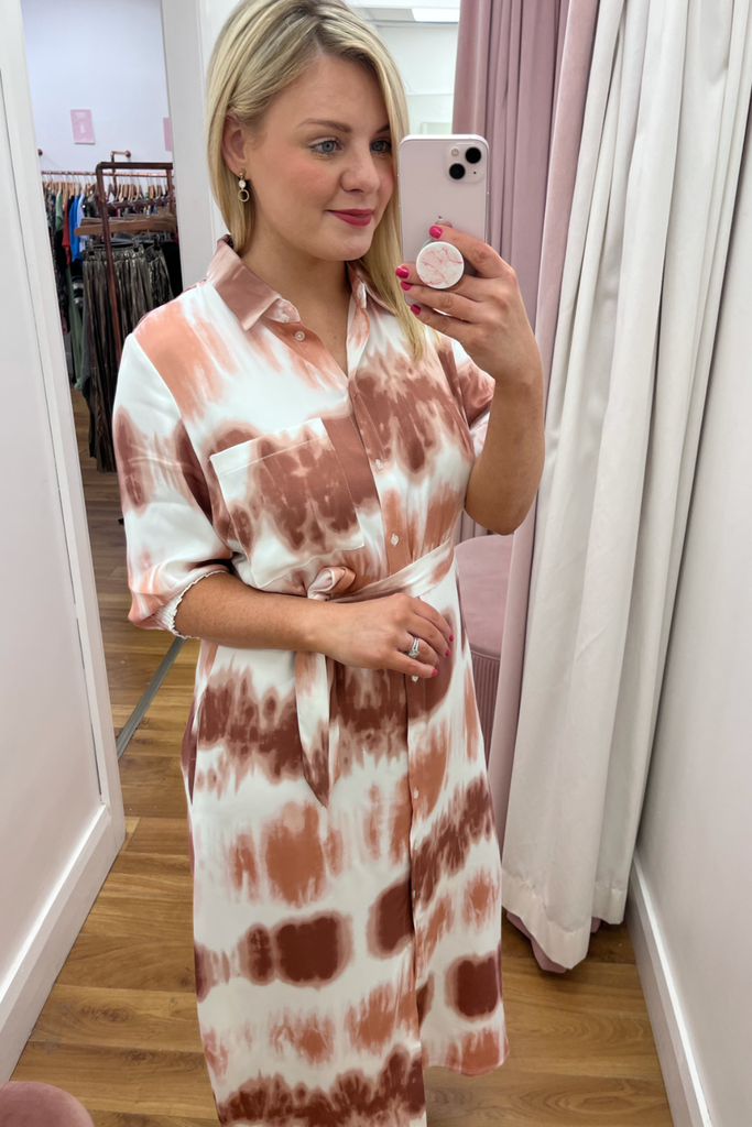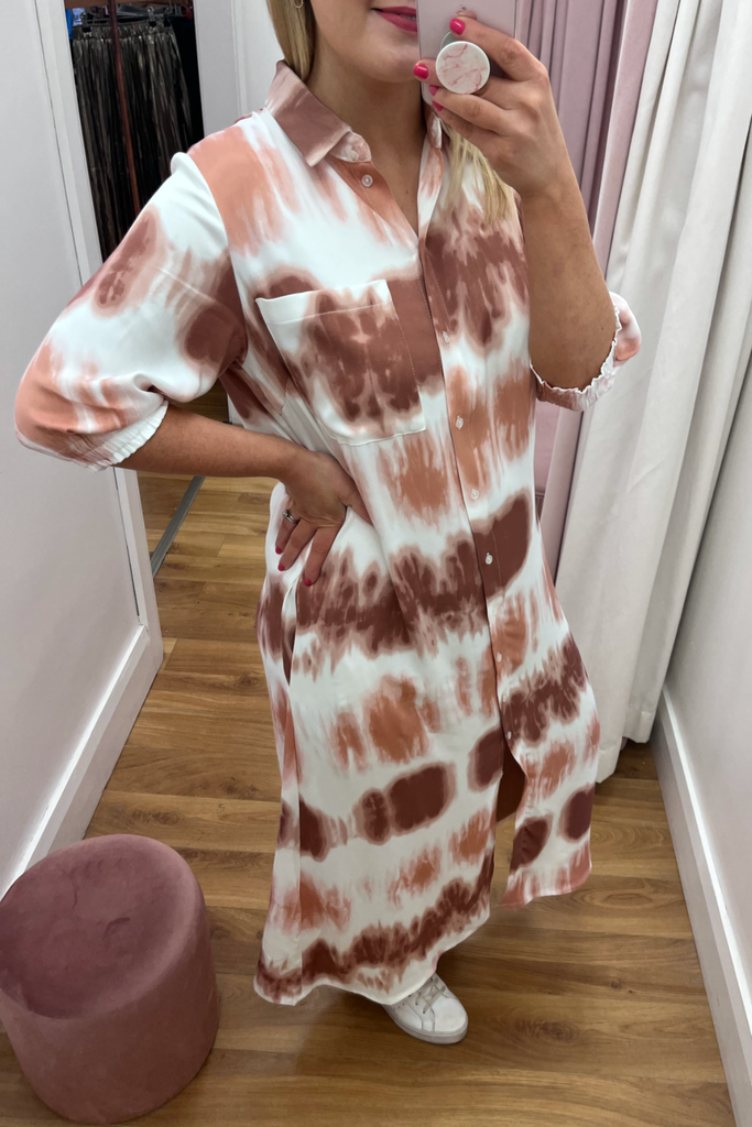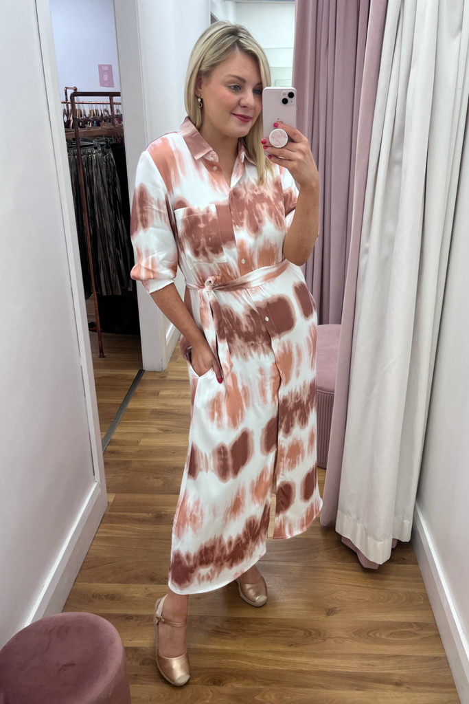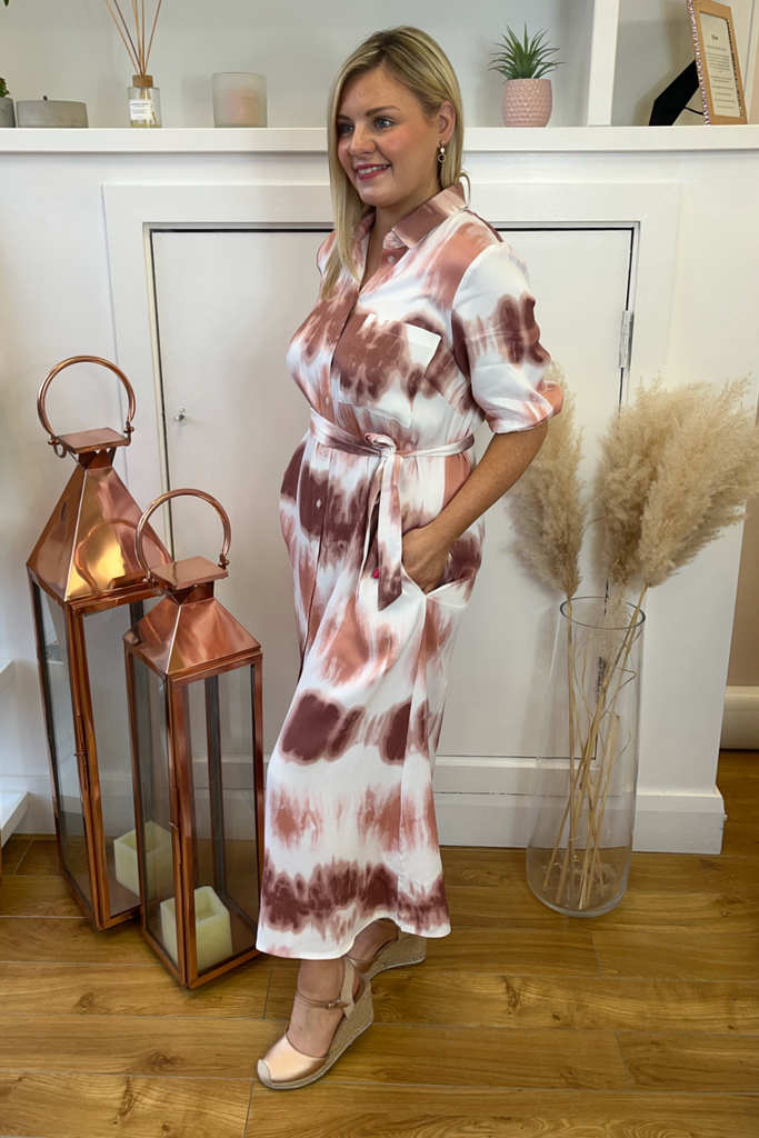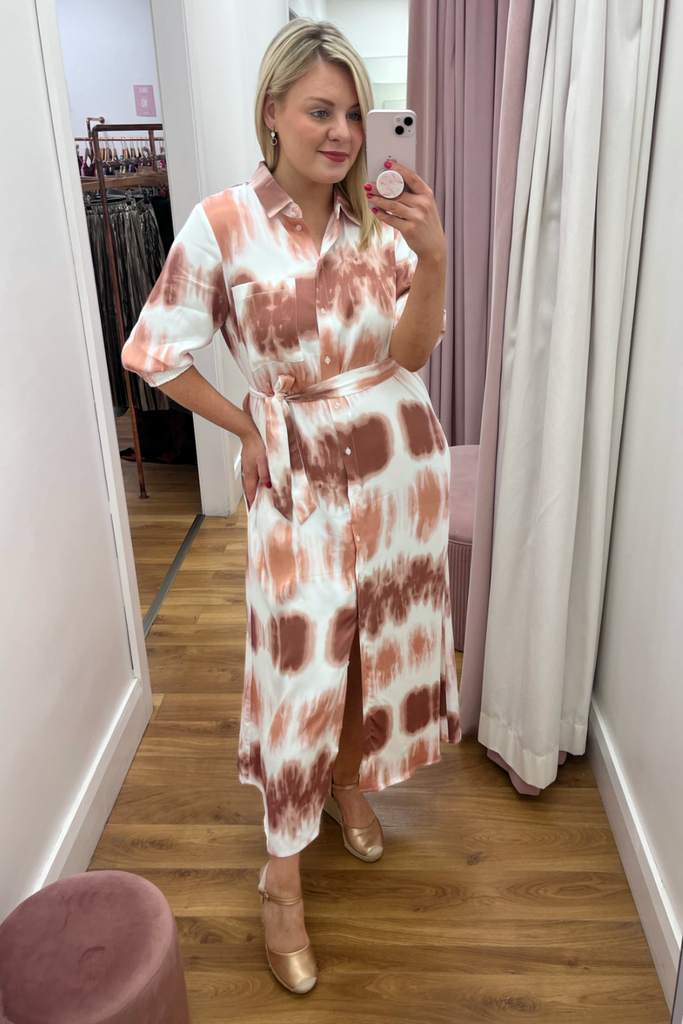An on-trend tie dye shirt dress in soft pinks and white. Features collared neckline, button-down front, pockets and half sleeve with elasticated cuff. With breast pocket and tie belt