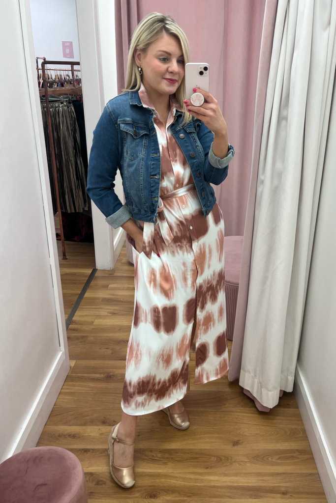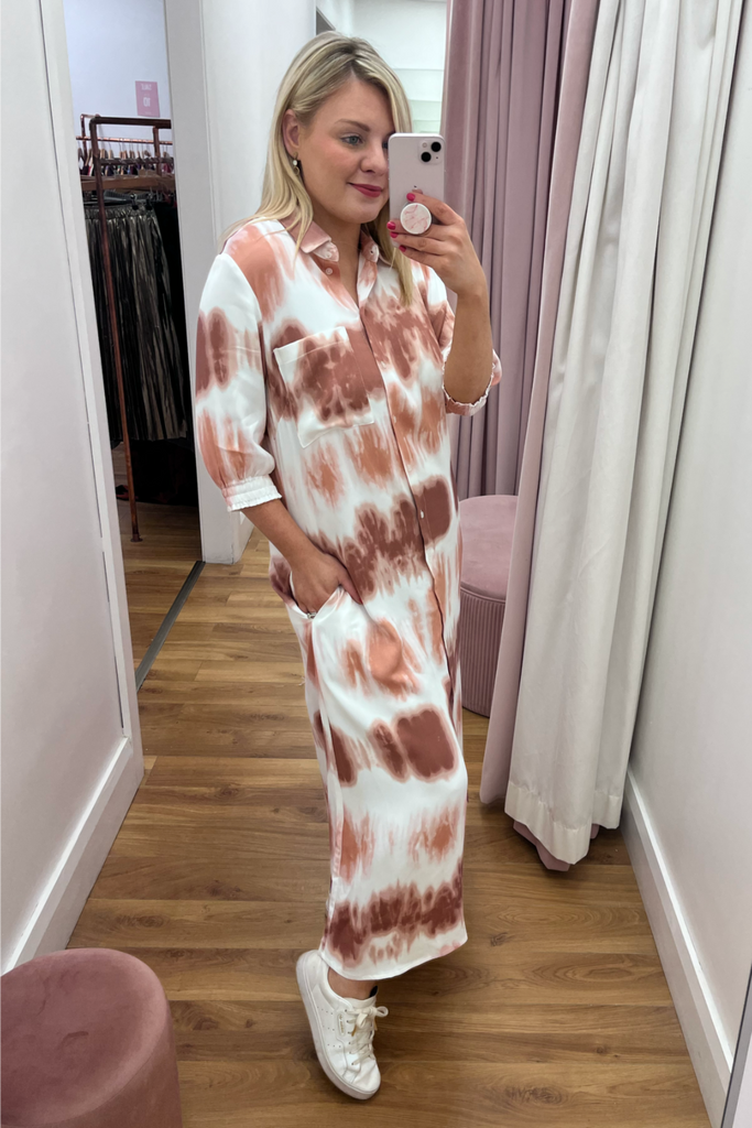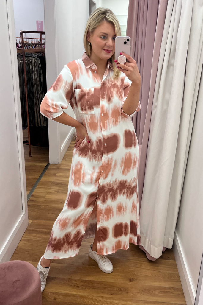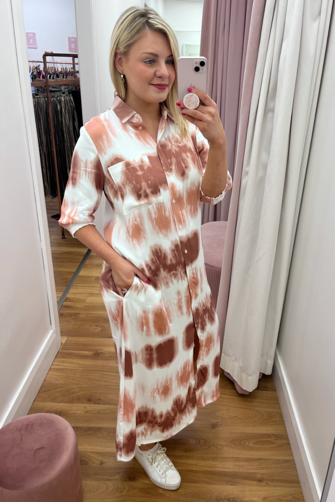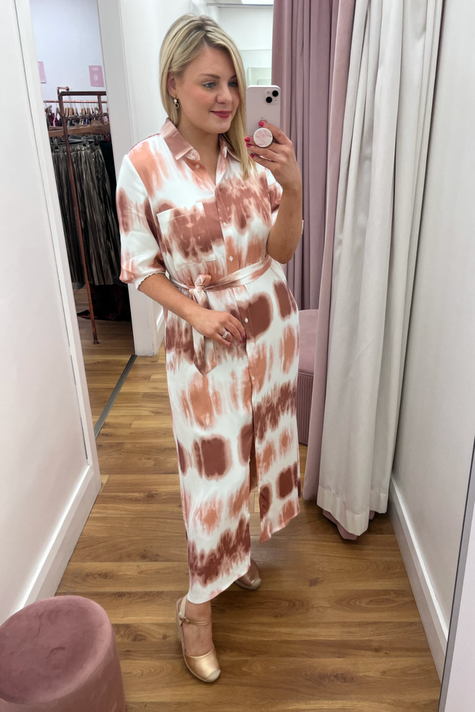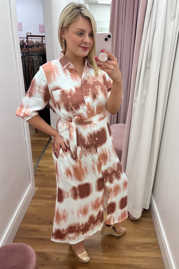 An on-trend tie dye shirt dress in soft pinks and white. Features collared neckline, button-down front, pockets and half sleeve with elasticated cuff. With breast pocket and tie belt