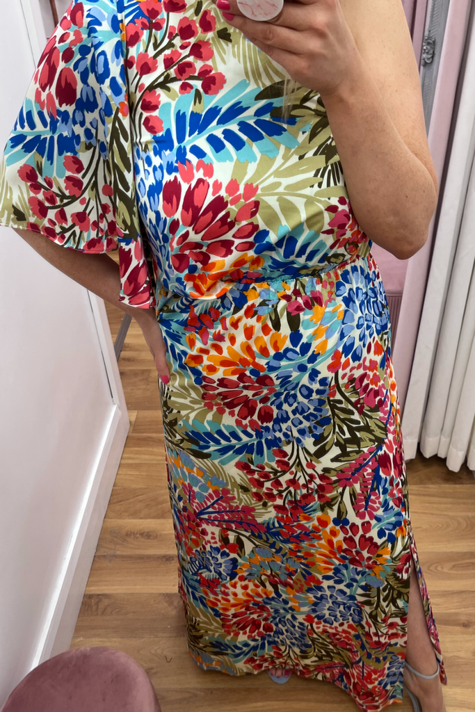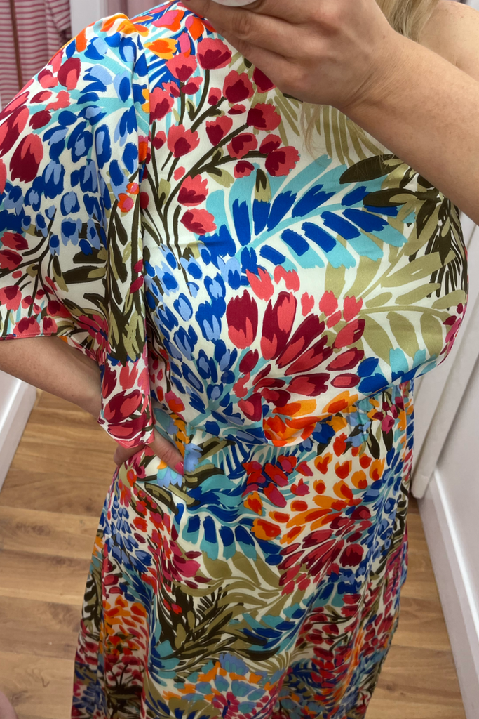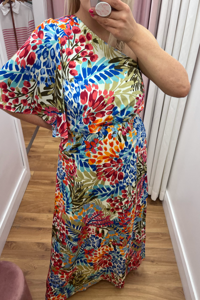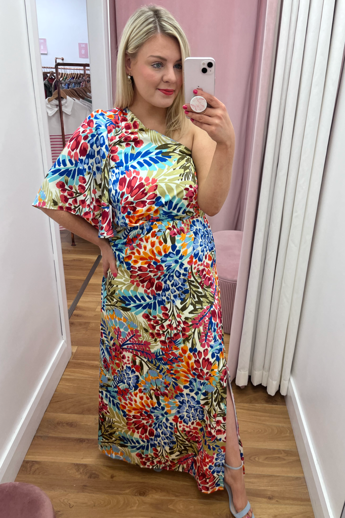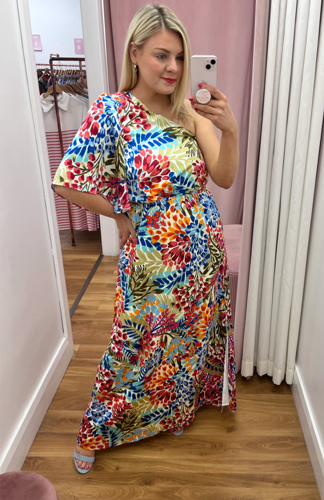 This bright and fun tropical print style comes in a gorgeous satin fabric in a mix of blues, green, pink and orange. It features a one shoulder neckline with a flowing cape half sleeve. An elastic waist helps to create shape and tops a long A line maxi with a side slit.