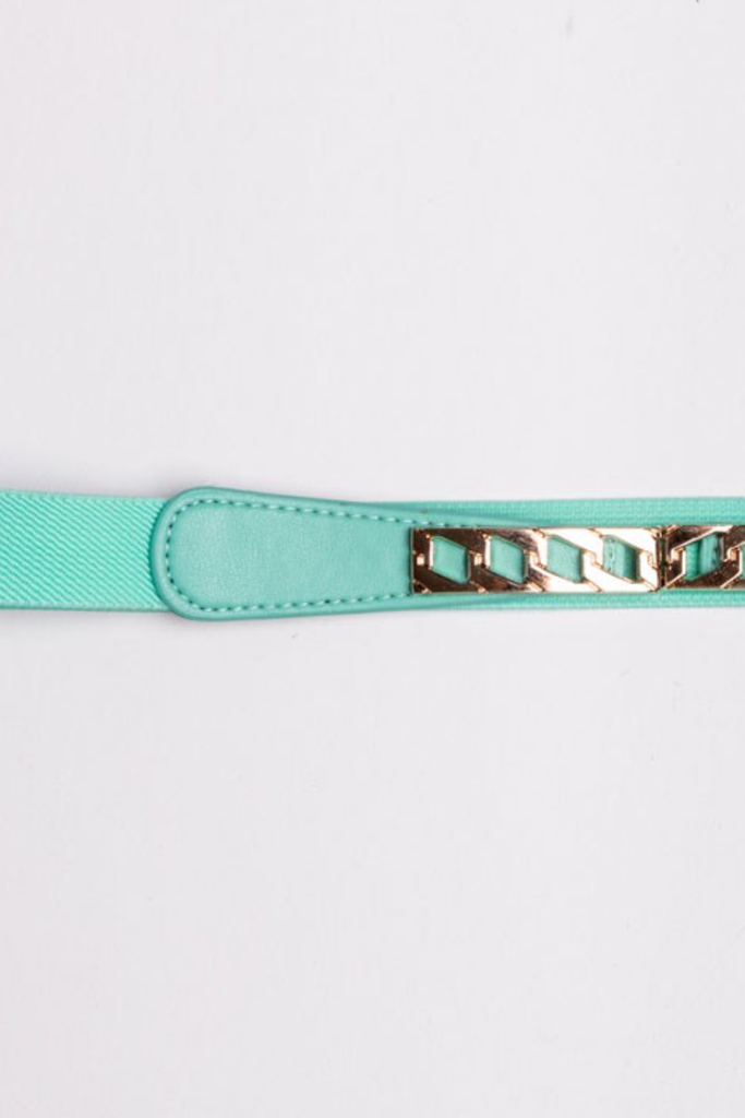 Thin pastel mint belt with gold statement buckle detail. Fastens to the front with a clasp