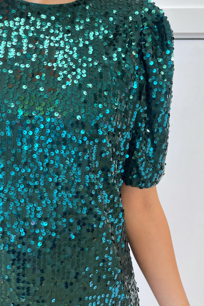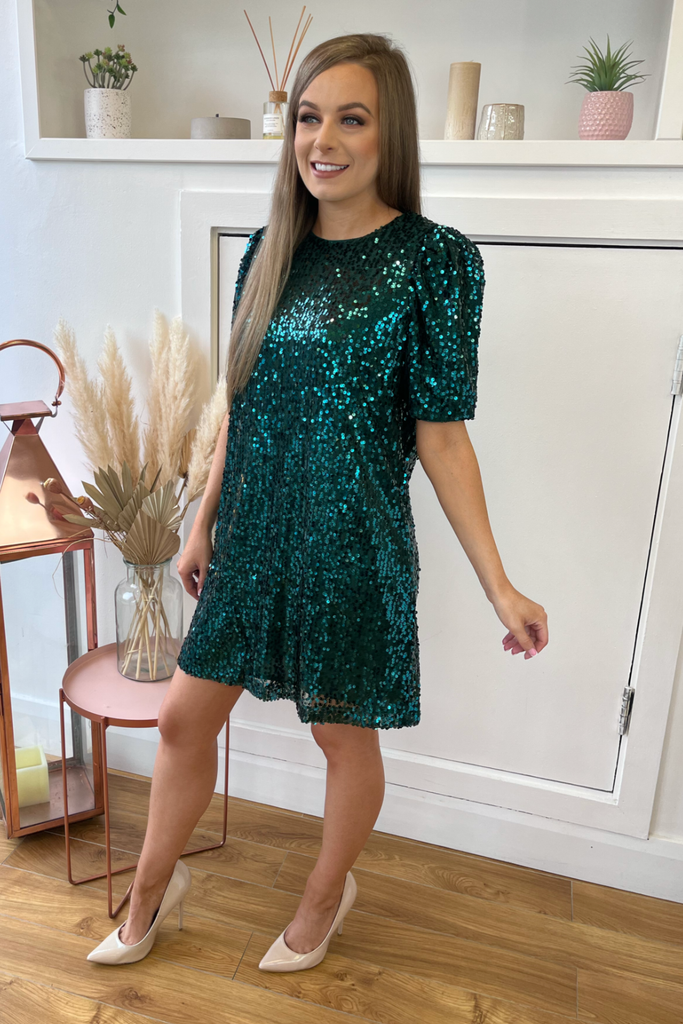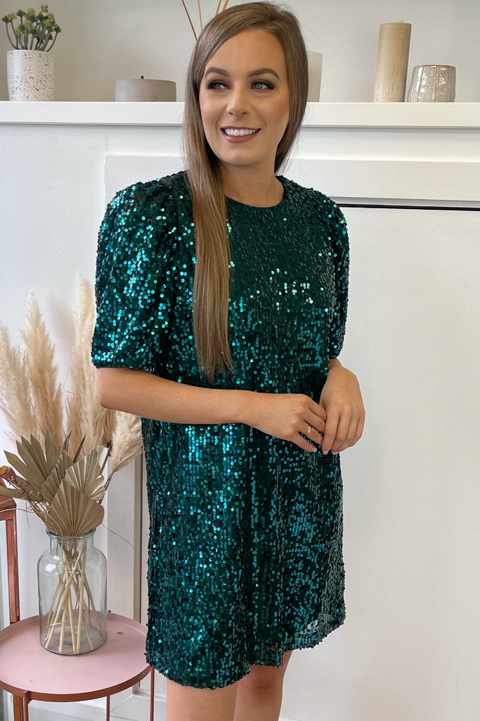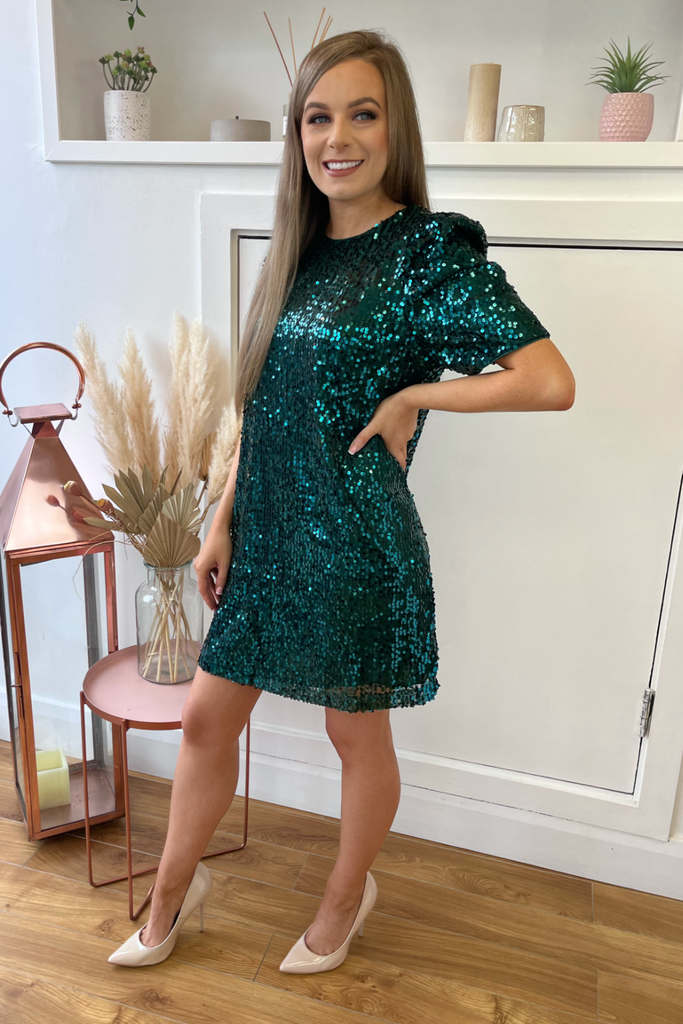 Sequin shift dress with half puff sleeve . It is fully lined with button and keyhole at the back. Perfect for those fun nights out over Christmas!