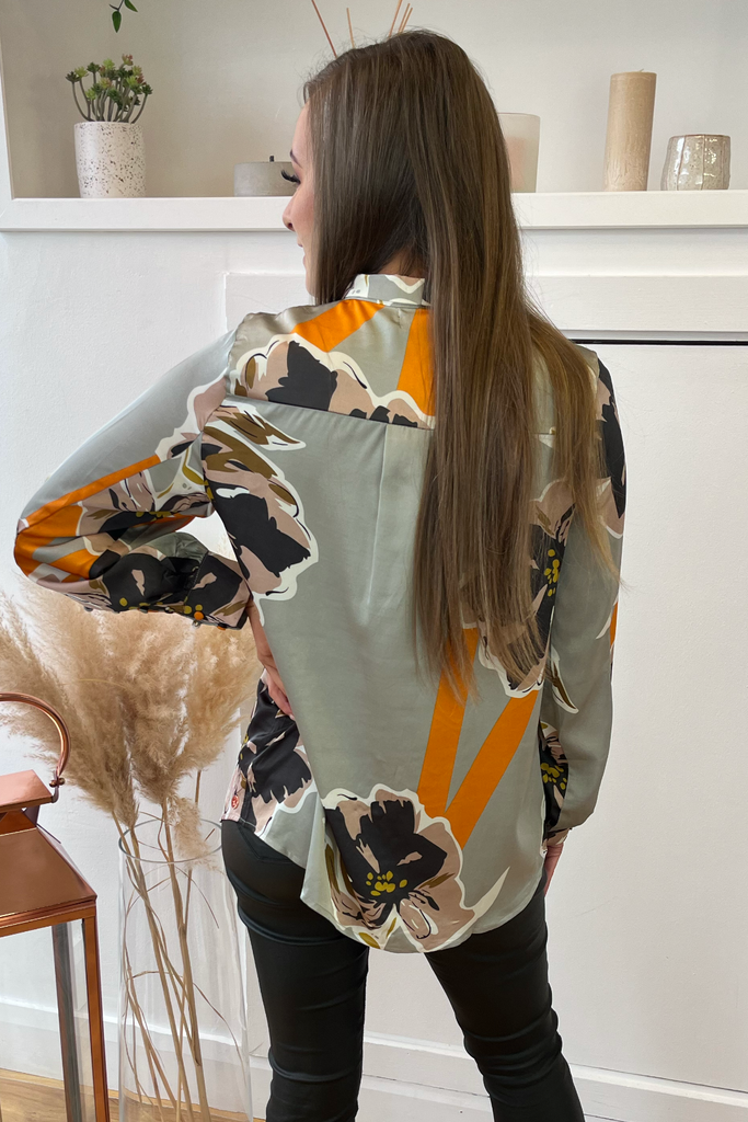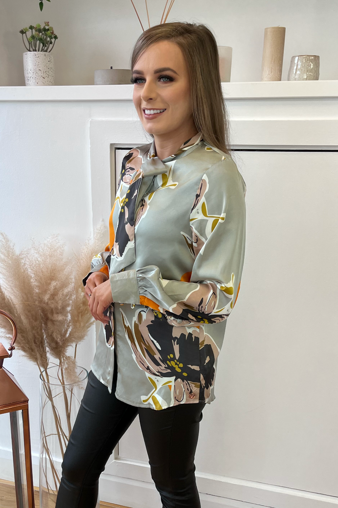 Light silver/grey blouse with a silky finish in a rich mix of Autumnal colours in a bold floral print. Features a neck tie for an extra dramatic look. It also features a balloon sleeve with buttoned detailing down both arms and cuffs