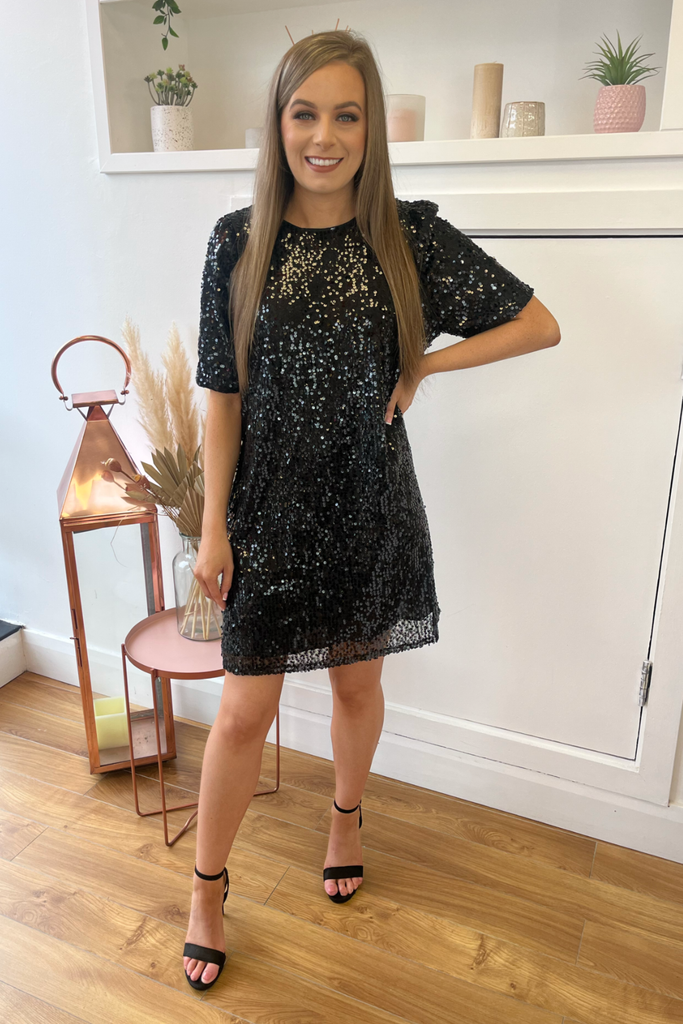 Holly sequin dress ✨ £79. Available in Jet Black, Rose gold or Emerald Green