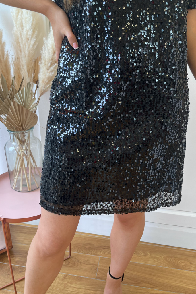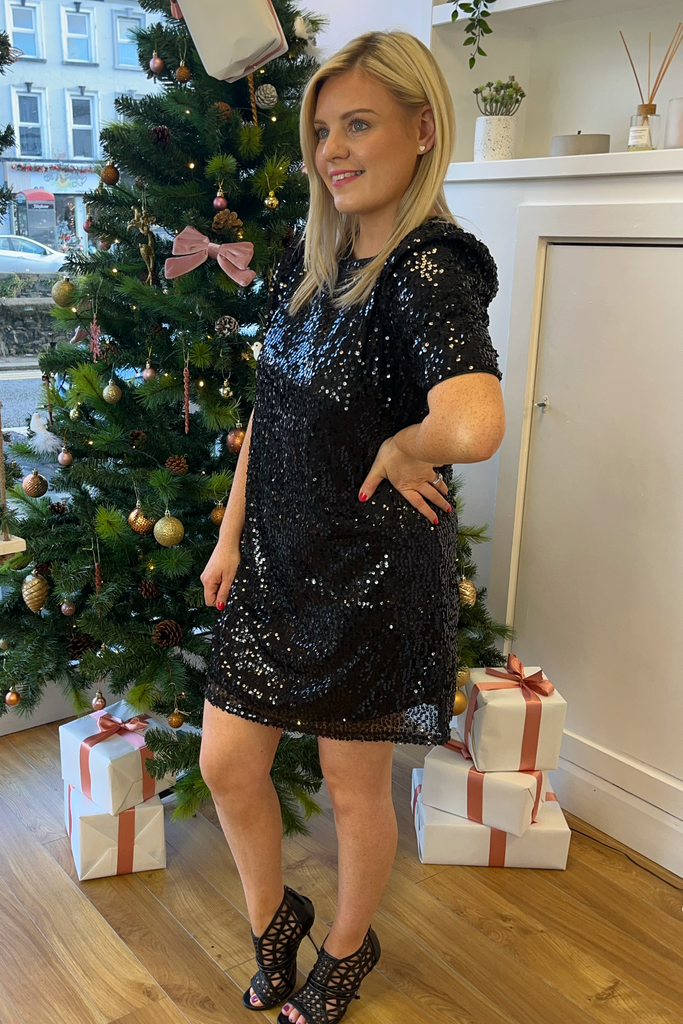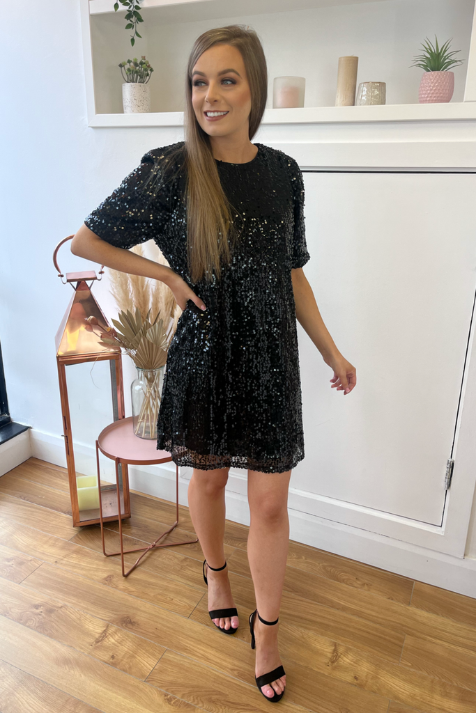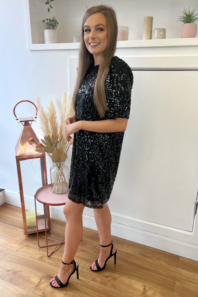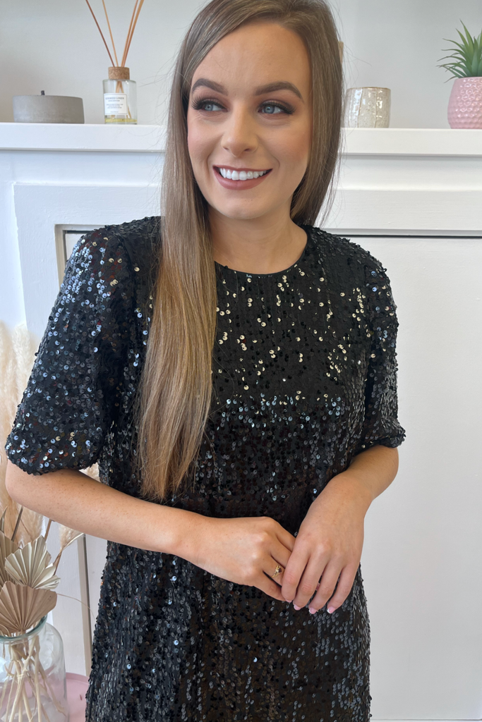 Sequin shift dress with half puff sleeve . It is fully lined with button and keyhole at the back. Perfect for those fun nights out over Christmas!