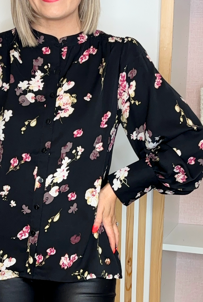 Printed buttoned blouse in a rich mix of pinks on a black base