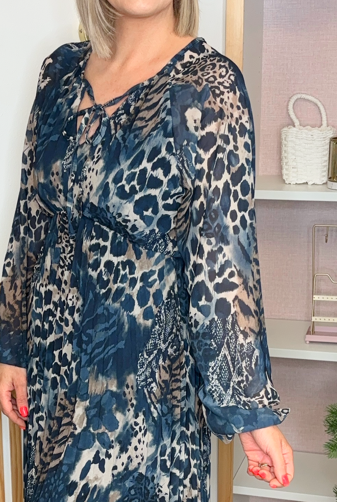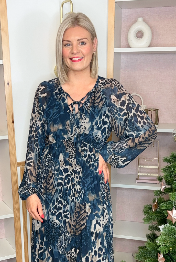 Round neck midi dress with tie neck, pleated skirt and tie belt. The body and skirt is lined and the sleeves are sheer