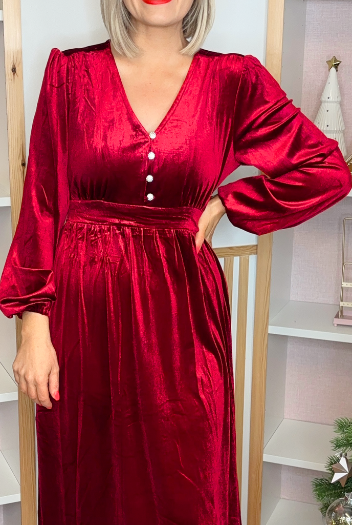 Velvet midi dress with balloon sleeve, V-neckline and banded waist. This style features jewelled button detailing on the front