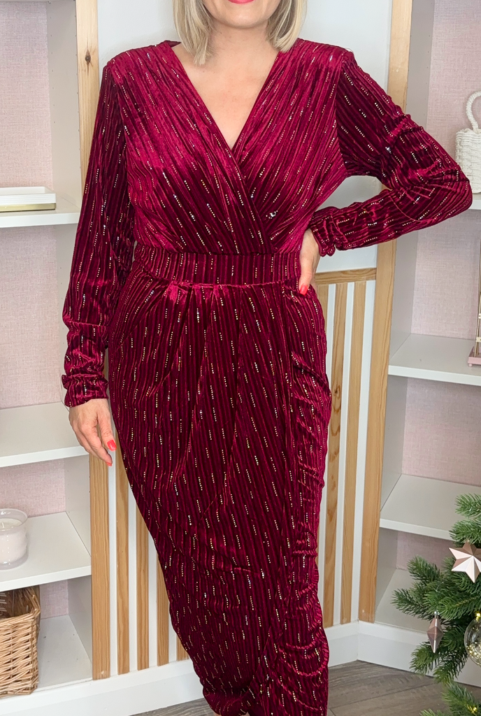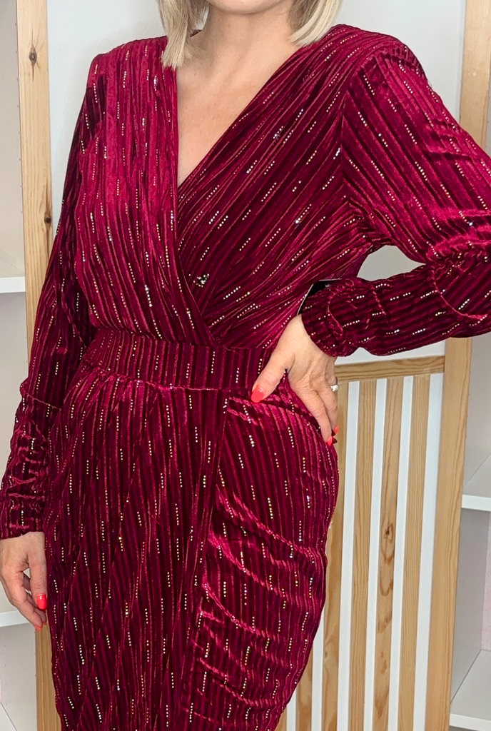 False wrap-over style at the neckline and skirt, with fitted waist and zips to the back