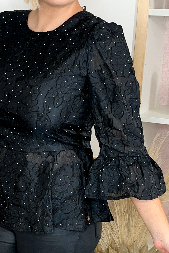 Statement black top with peplum hemline and dramatic sleeve. Zips to the back in a V neckline