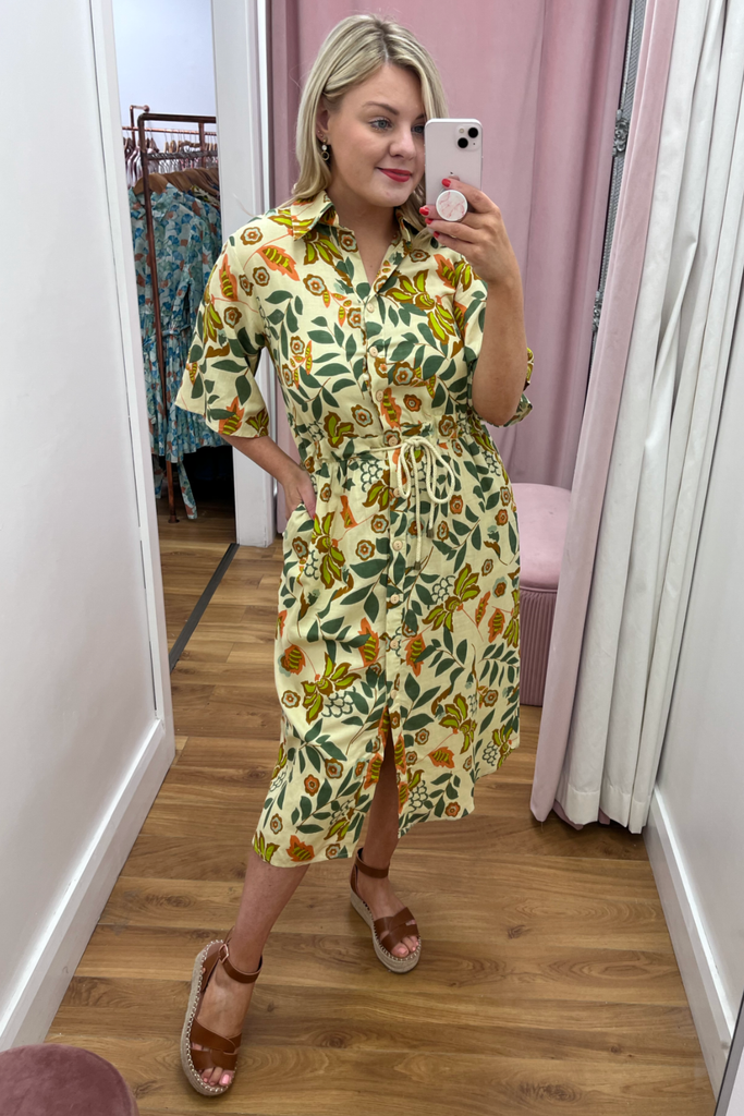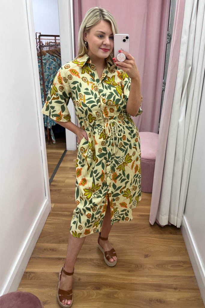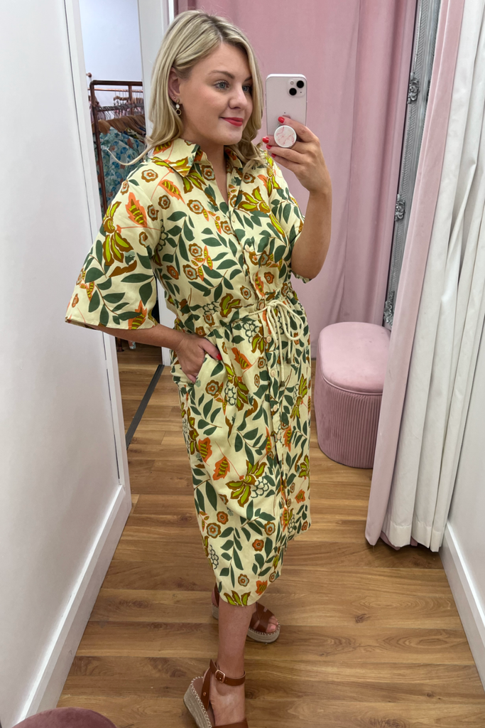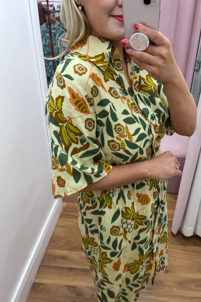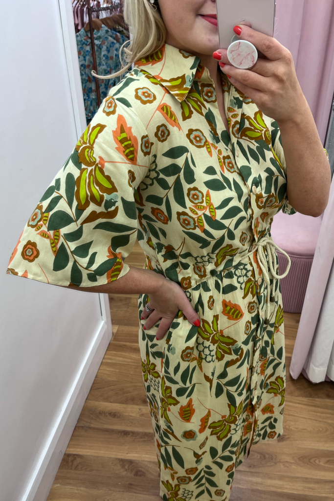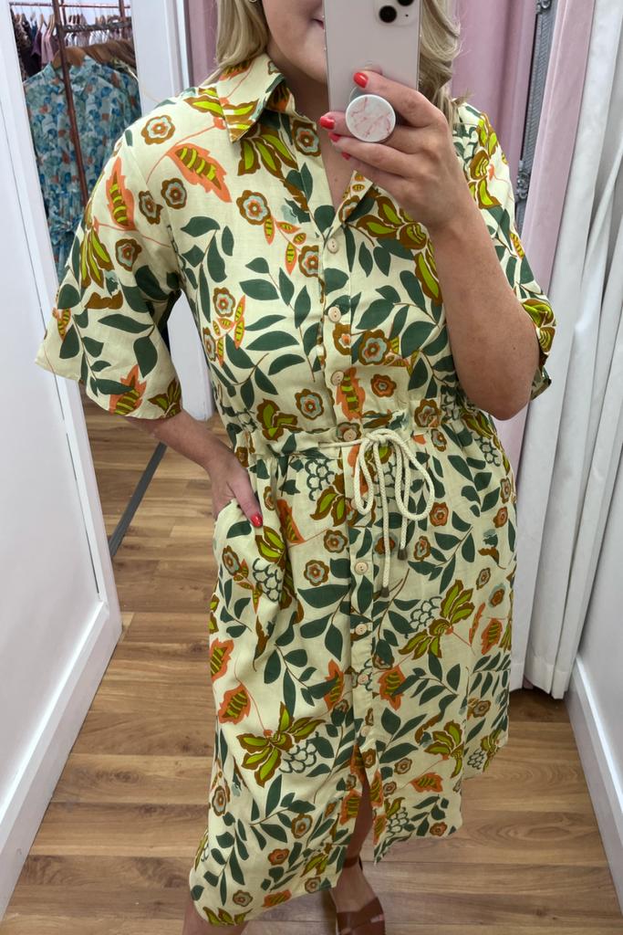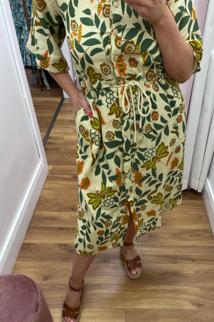 Rich floral print mid-length dress in a mix of greens, coral and tan. With collared neckline, 3/4 sleeves and draw string waist to give both comfort and shape. It has a soft linen type feel.