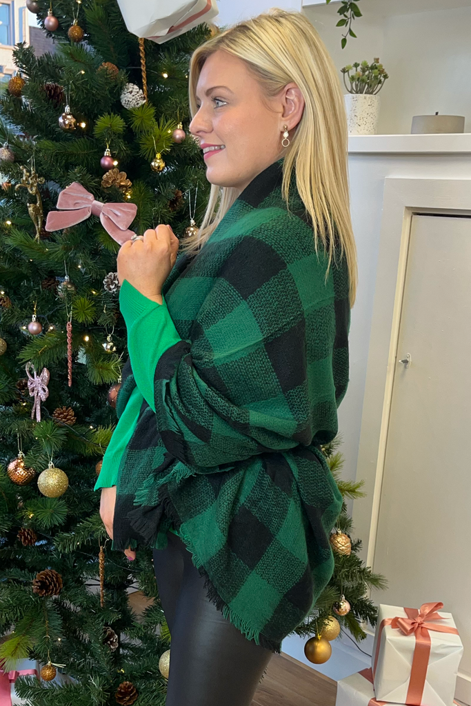Keep warm this winter with this luxurious square plaid blanket scarf in a mix of green and black. It has frayed edges. Treat yourself or gift it to someone special!