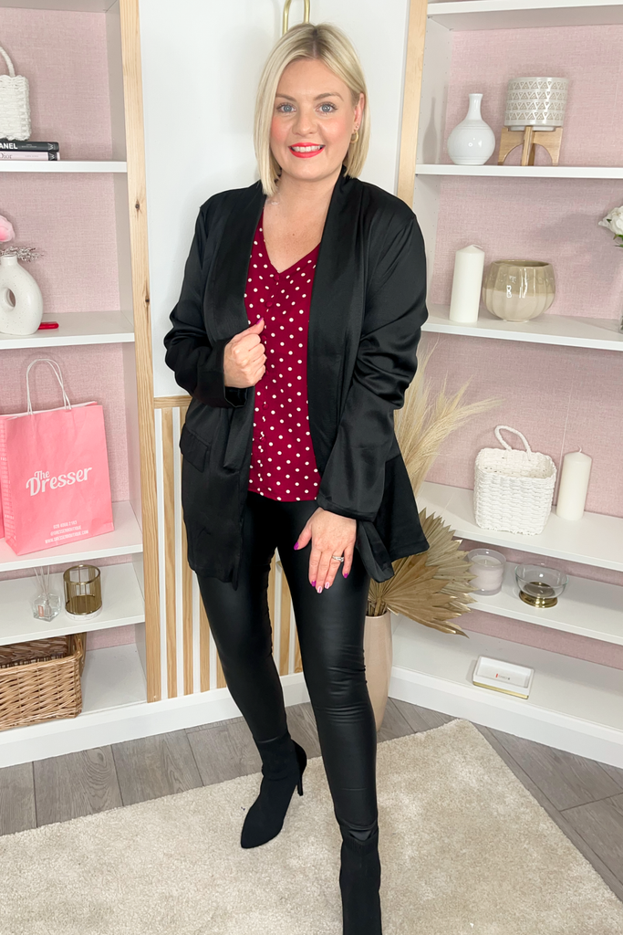 Black blazer with silky satin finish, lapels and front pockets. This style is light-weight and unlined
