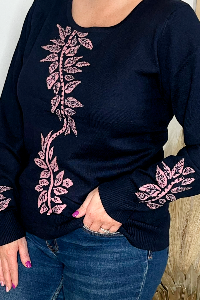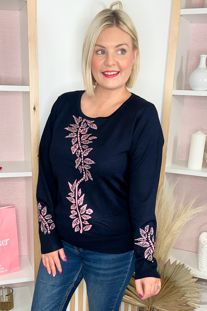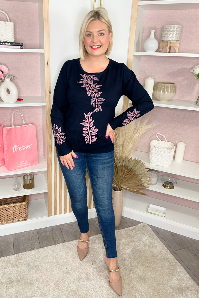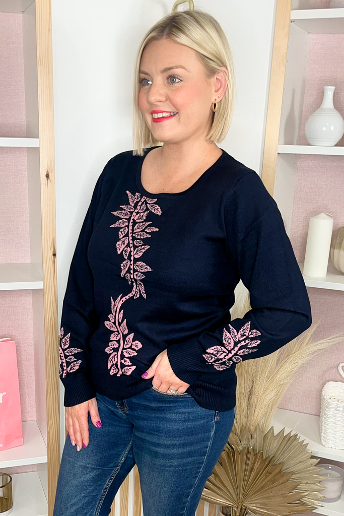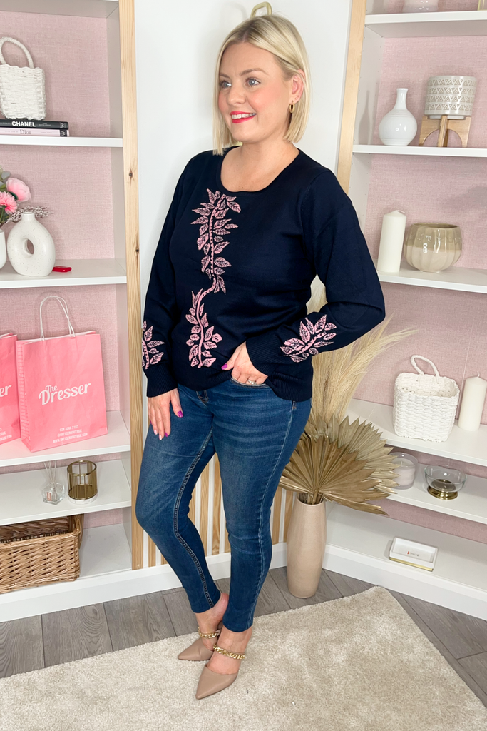 Navy jumper with scoop neckline and soft pink floral motif with subtle sequin
