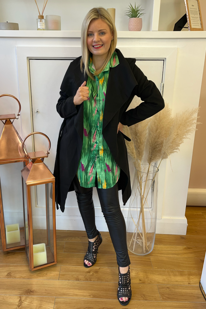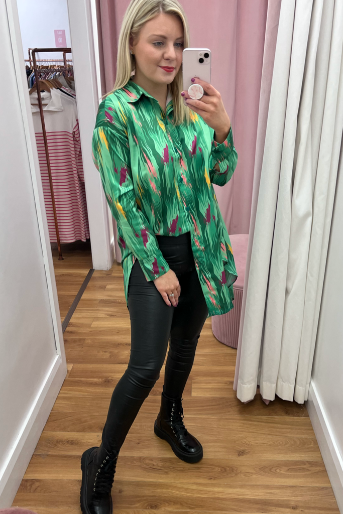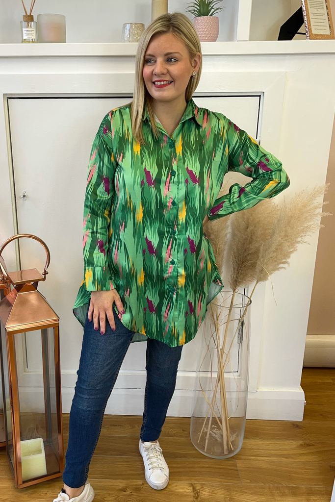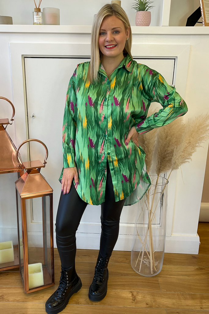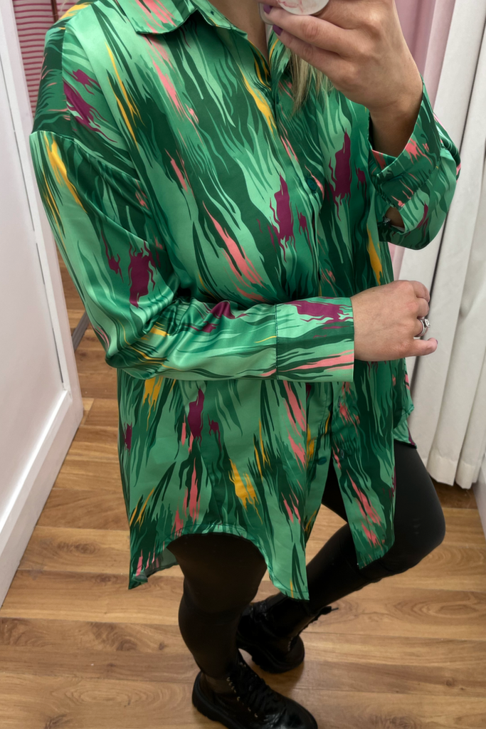 Oversized dipped hem button-down Shirt/Shirt dress with bold multi-colour abstract print. It has a satin finish. Perfectly paired with tights, leggings or denims!