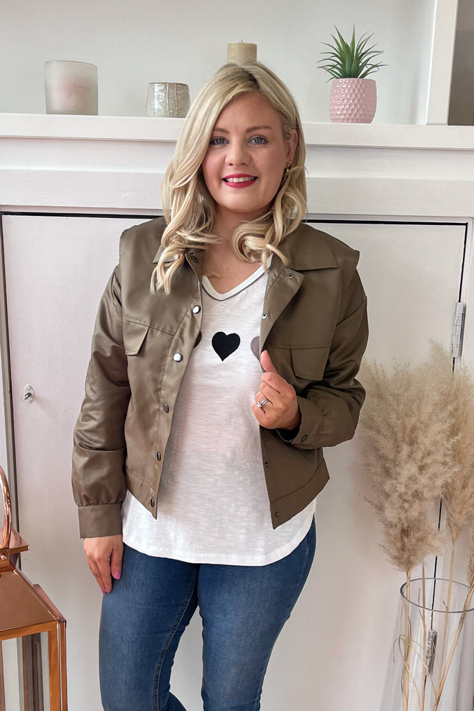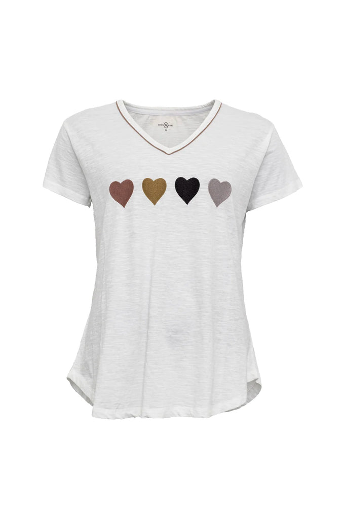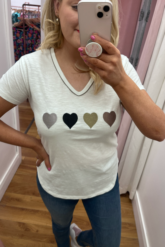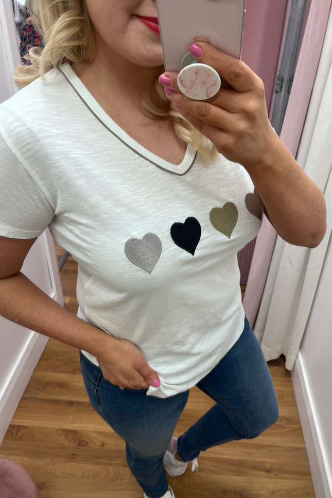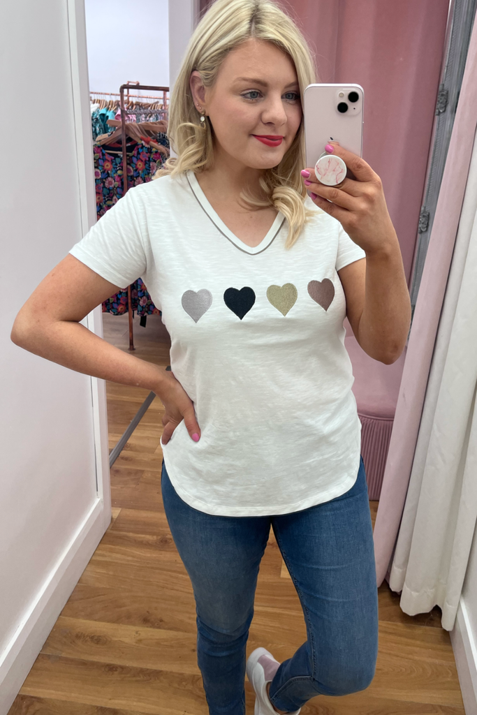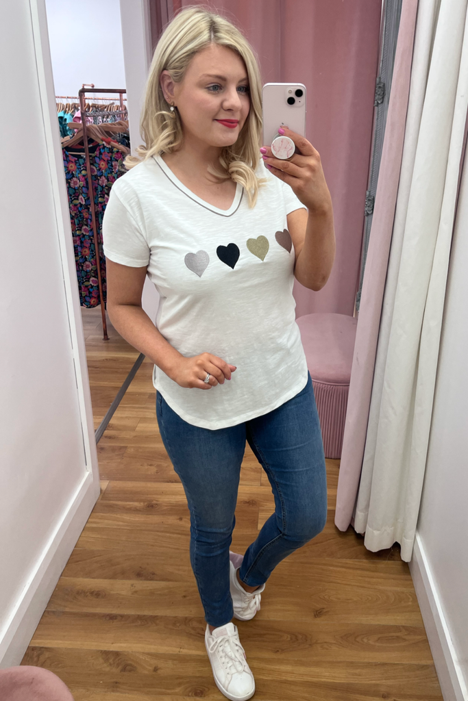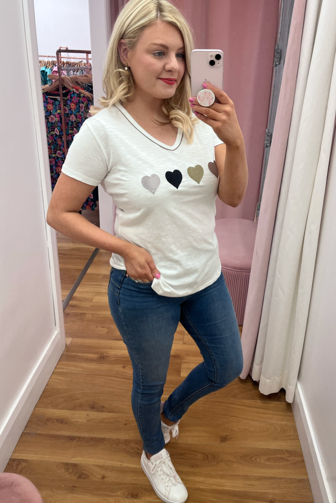 Soft white tee with multi-coloured hearts in a metallic finish, and coloured trim along the neckline. Perfect with coloured or blue skinnies