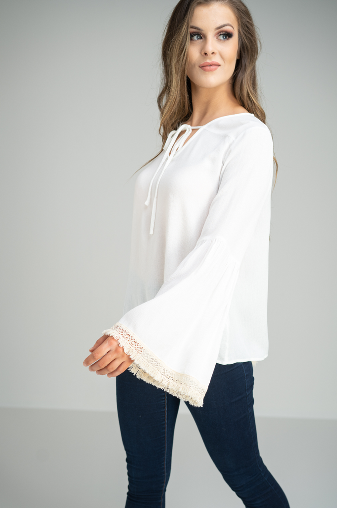 Loose fitting white blouse with wide sleeves with fringed cuffs