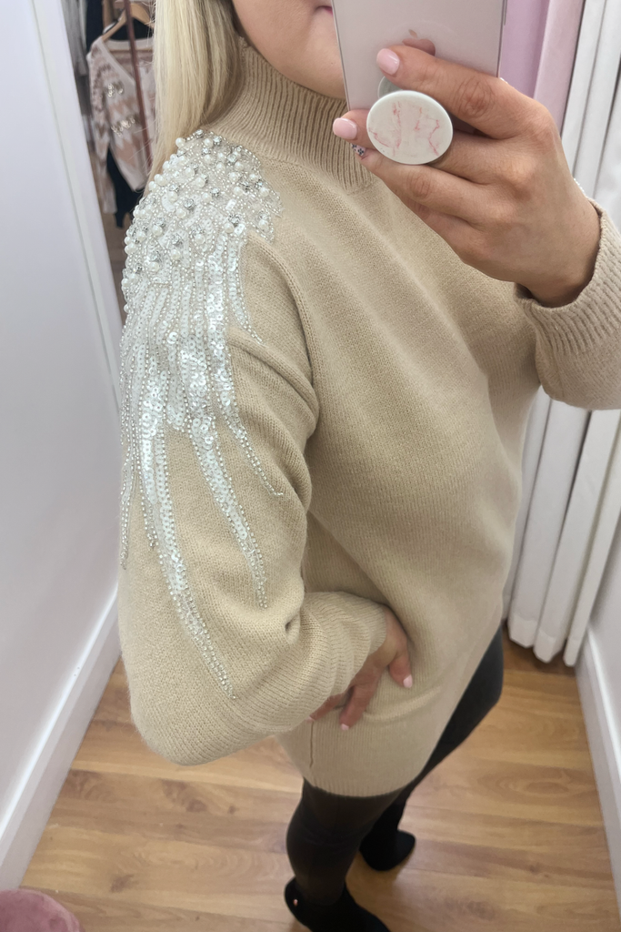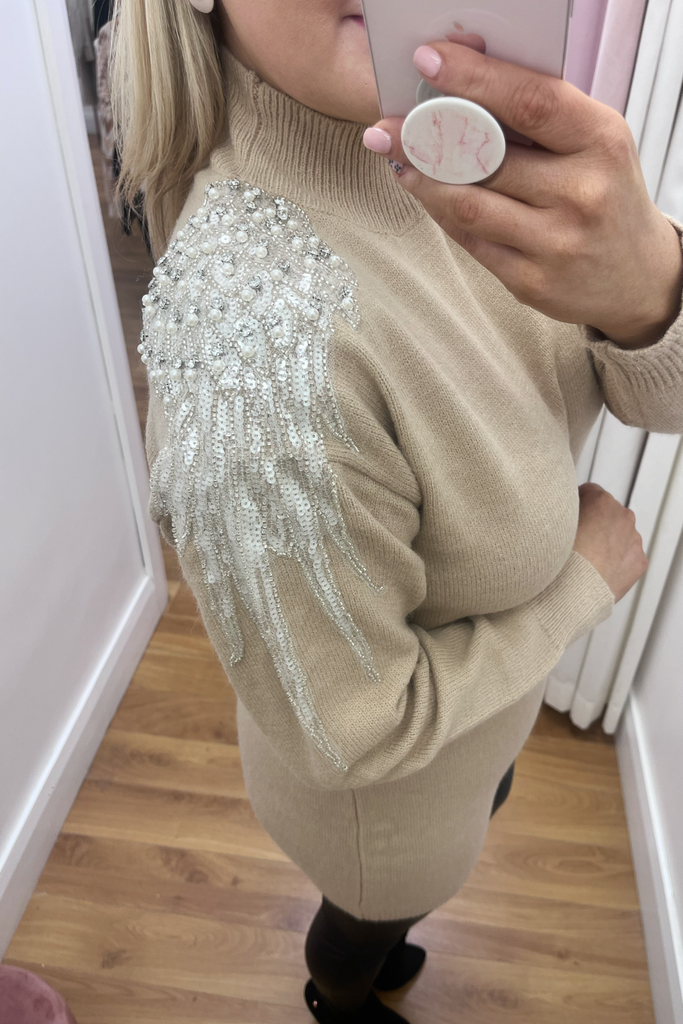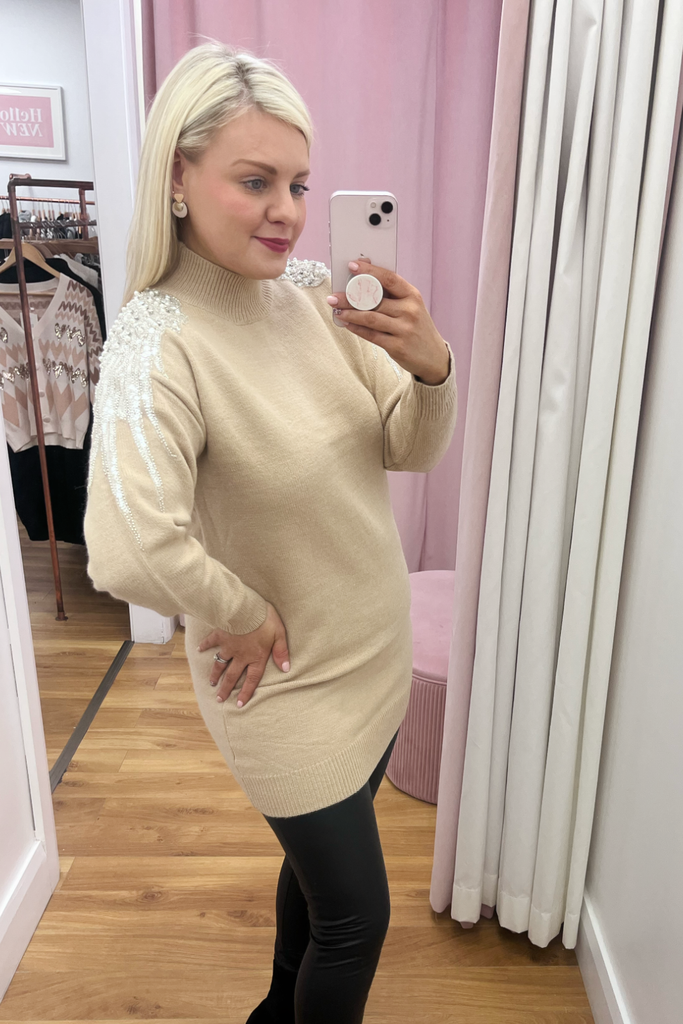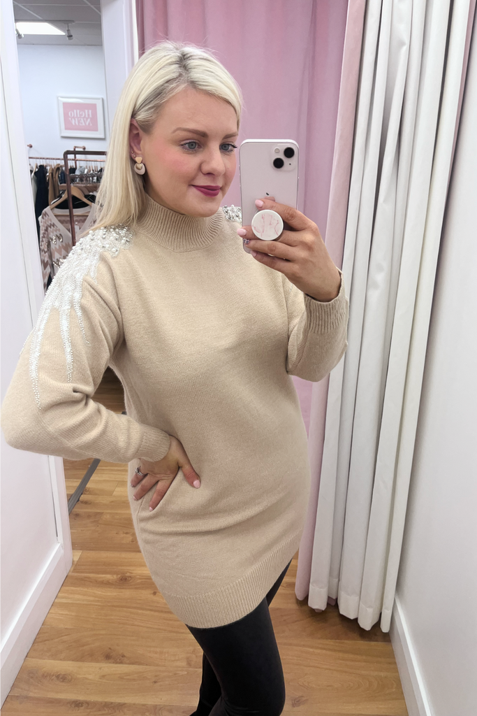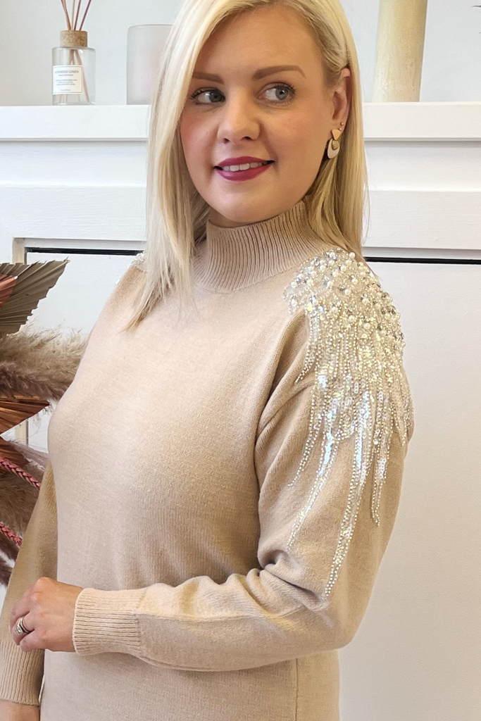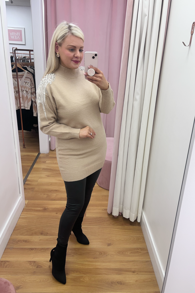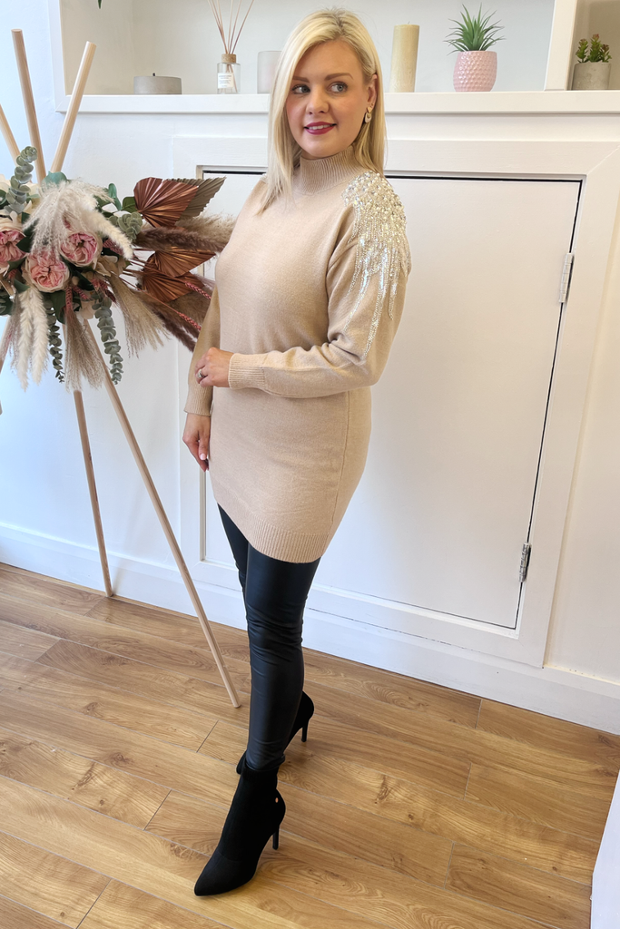 Super soft, quilted feel jumper dress with roll neck. Features statement embellished sleeve in a mix of sequin and pearl. Style it with tights or over leggings for a dressed-down look, or heels for party season!