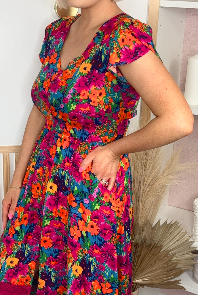 V-neck style with buttoned front, frilled cap sleeve and elasticated waist. The skirt has a front split and tiered bottom.