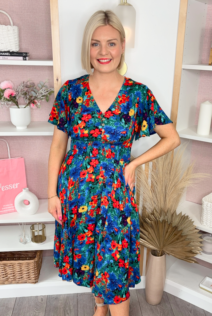 V-neck style with half flutter sleeve, deep elasticated waist and floaty skirt. With pockets!