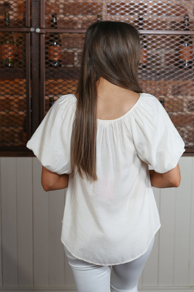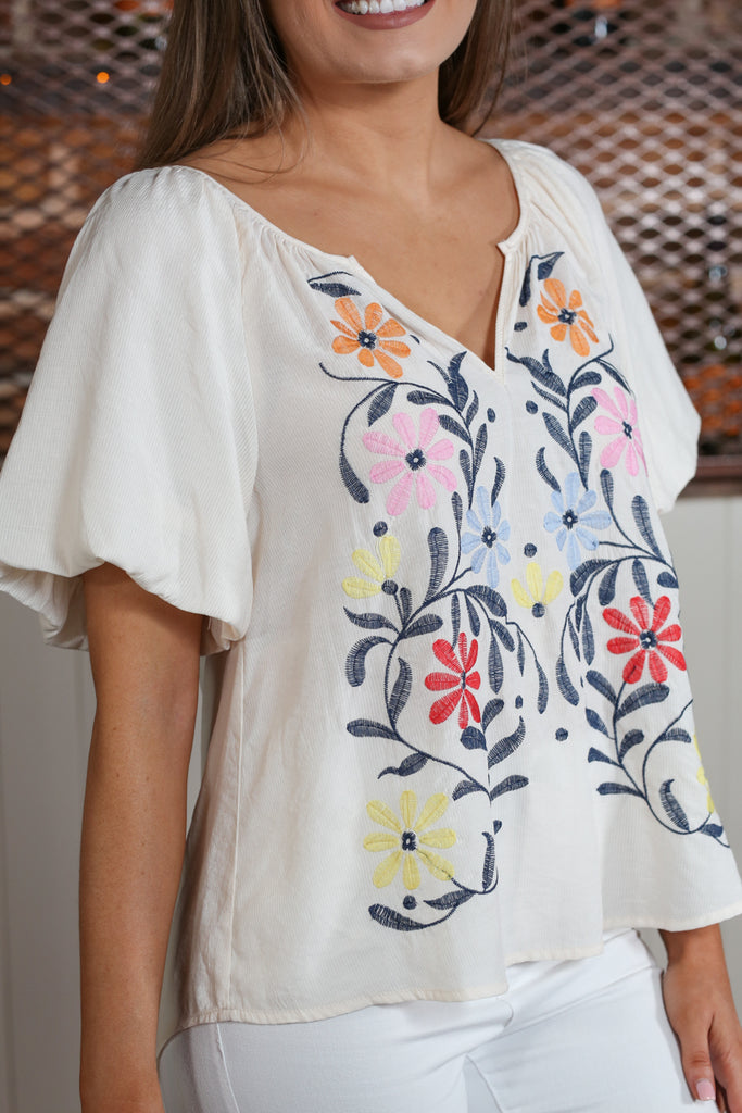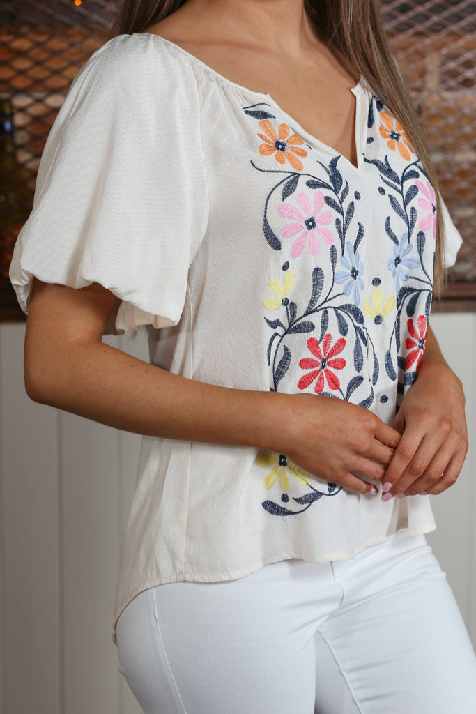 Ivory top with colourful floral embroidered detailing on the front in blue, pink and lemon. Features a V-neckline, half puff sleeves and relaxed fit body.