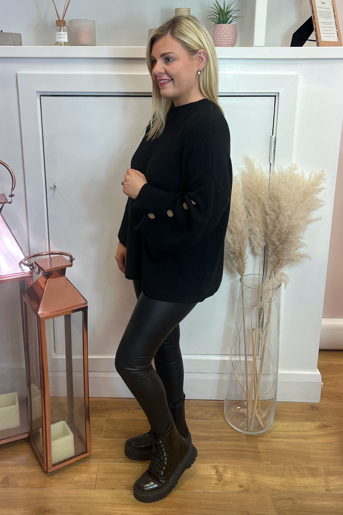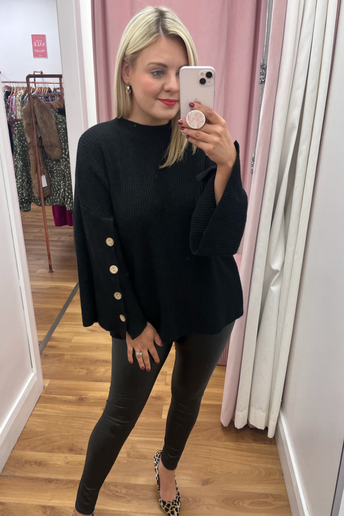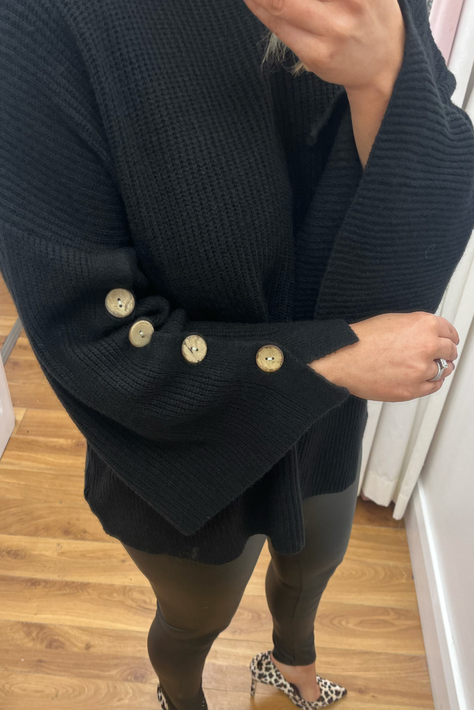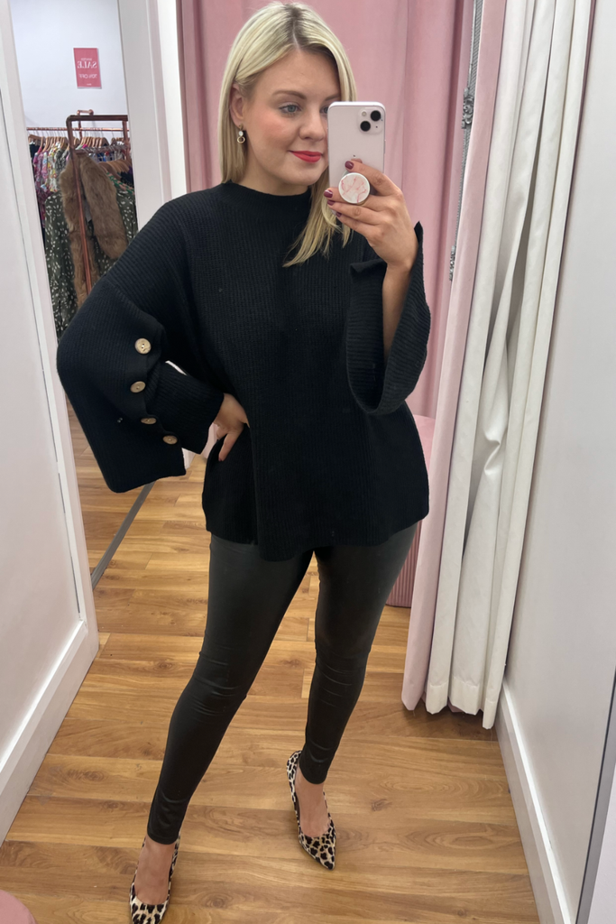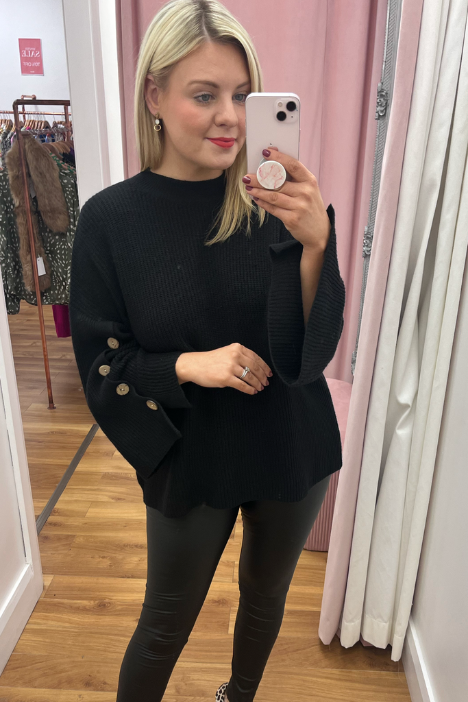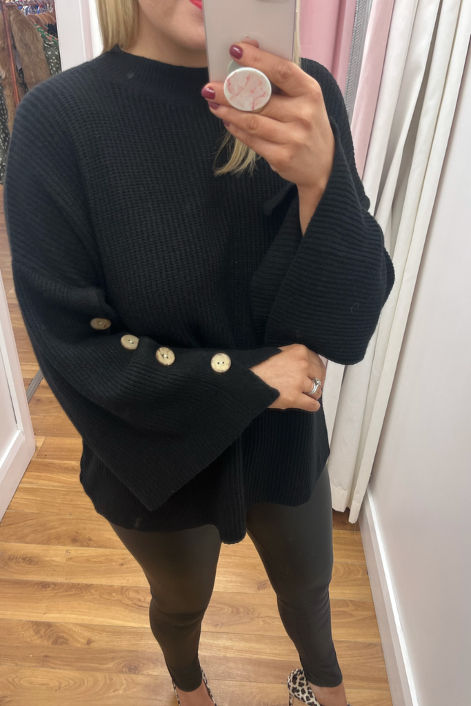 A mid-weight knit with wide 3/4 length sleeves with button detail. It has a round neckline and subtle ribbed texture with a relaxed fit in the body