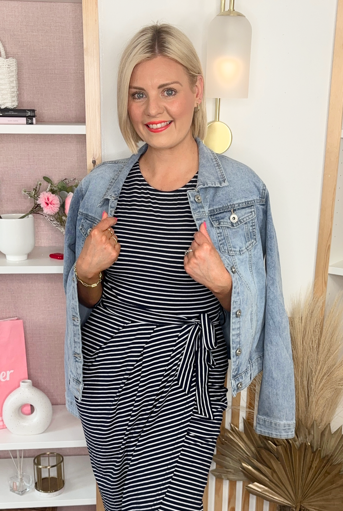 Round-neck striped dress with wrap-over skirt and self tie belt