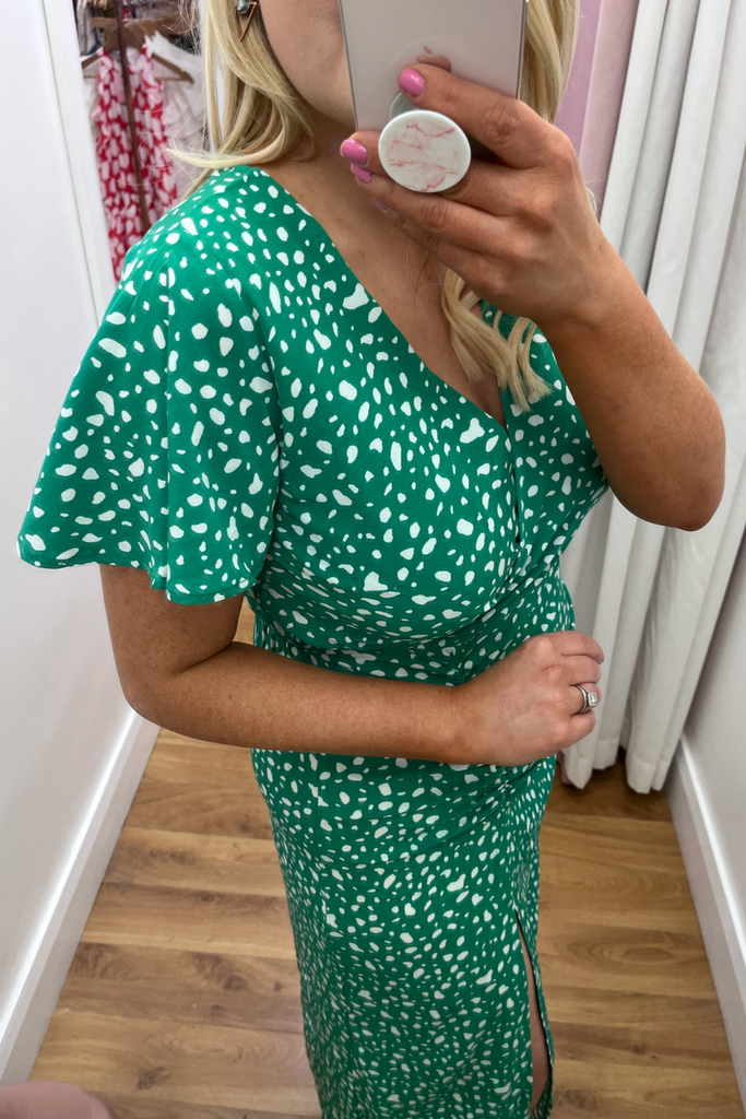 * Best-seller Restocked* Striking printed green dress with wrap style neckline and ruched detail giving the best shape! It also has an elastic waist band giving a form-fitting finish but with comfort, and leg split. This style is light weight and unlined