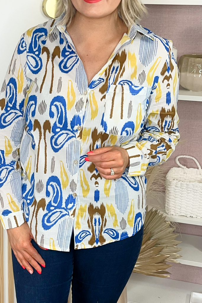 Colour buttoned blouse in the dreamiest mix of blues and chocolate. With breast pocket. Perfect layered under a jumper or one of our knitted vests!