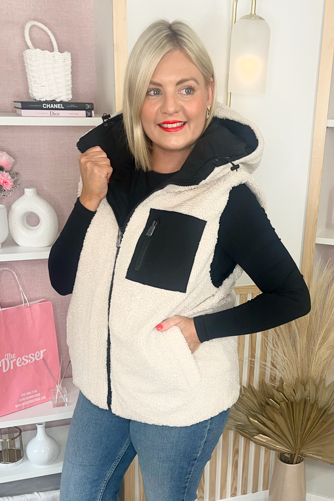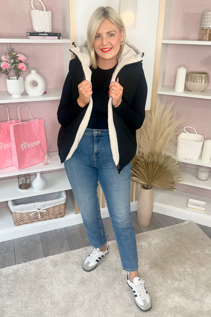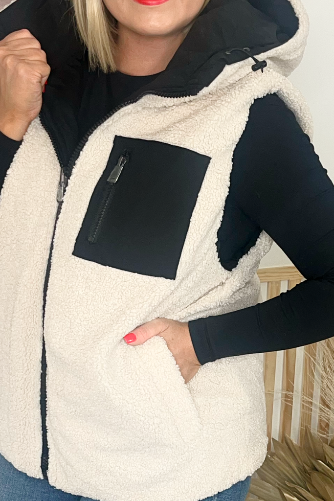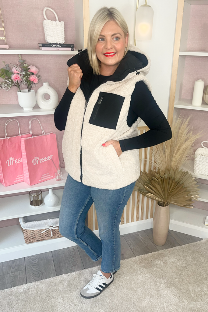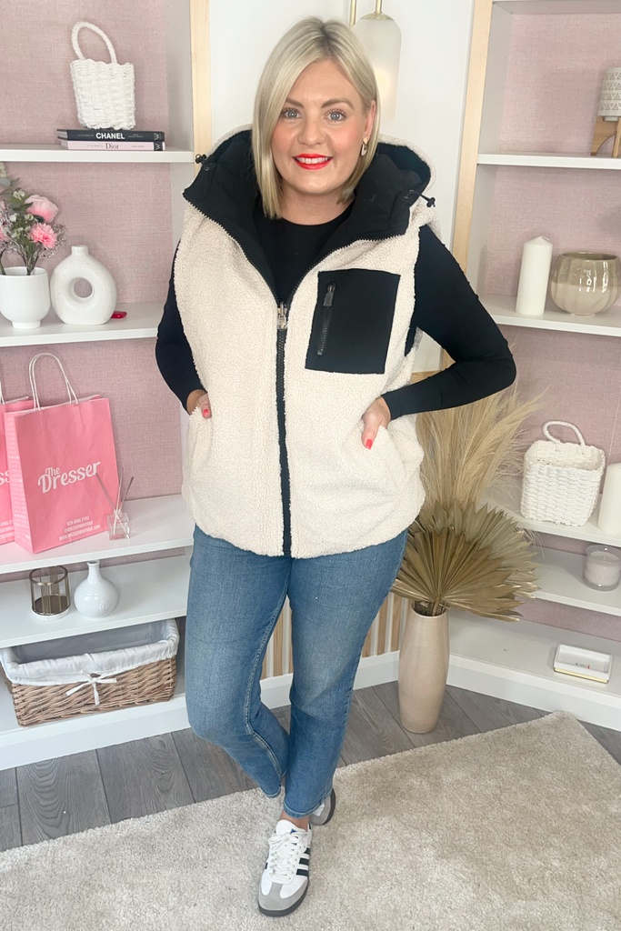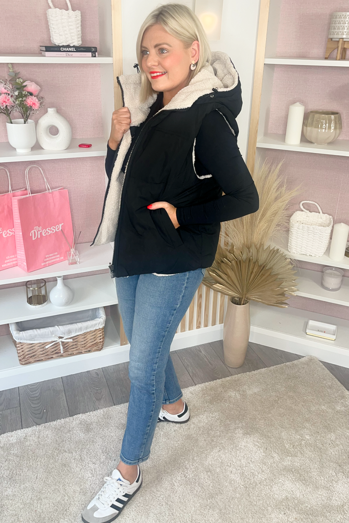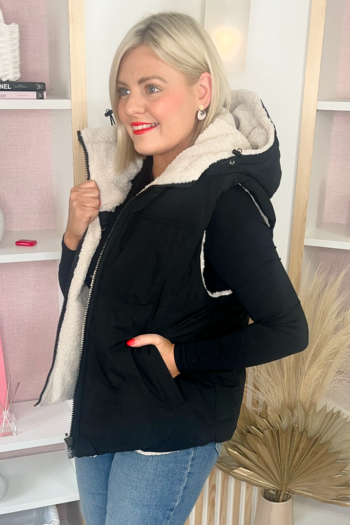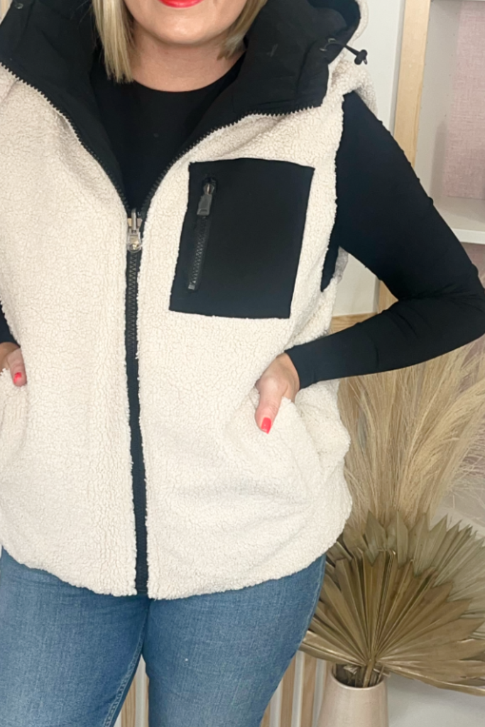 Fully reversible sleeveless gilet in gorgeous quilted fabric with hood with adjustable drawstring. Zip closure on the front and Piped raglan pockets on the sides. Teddy fur lining on one side.