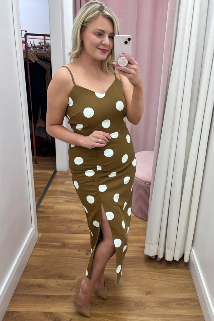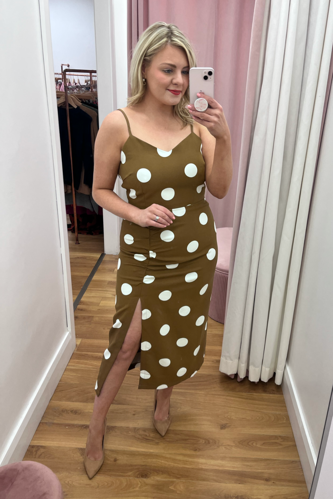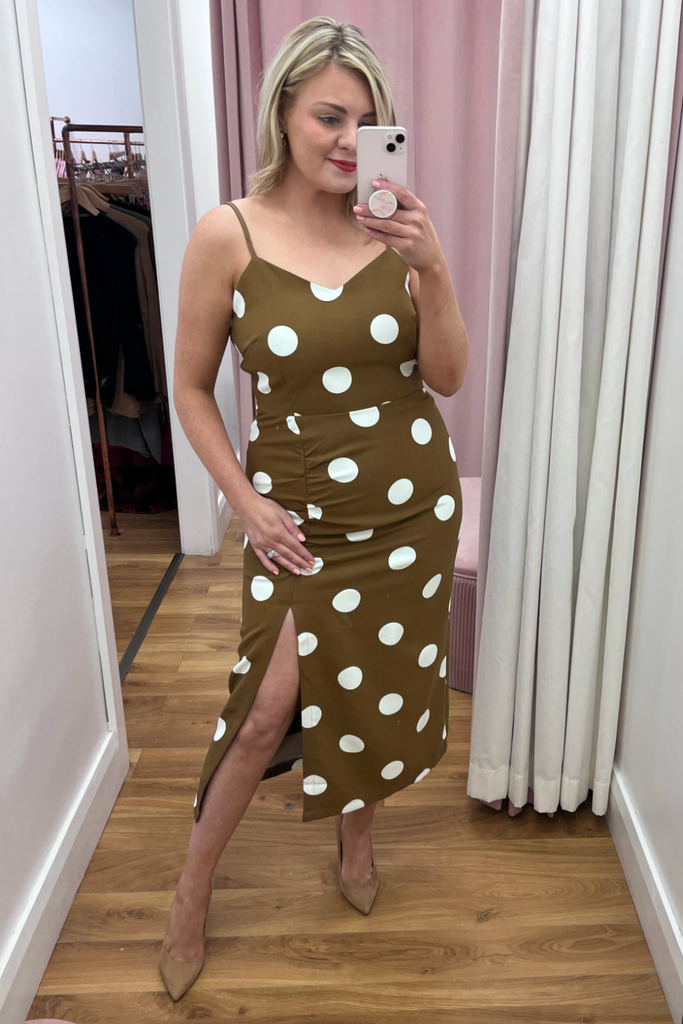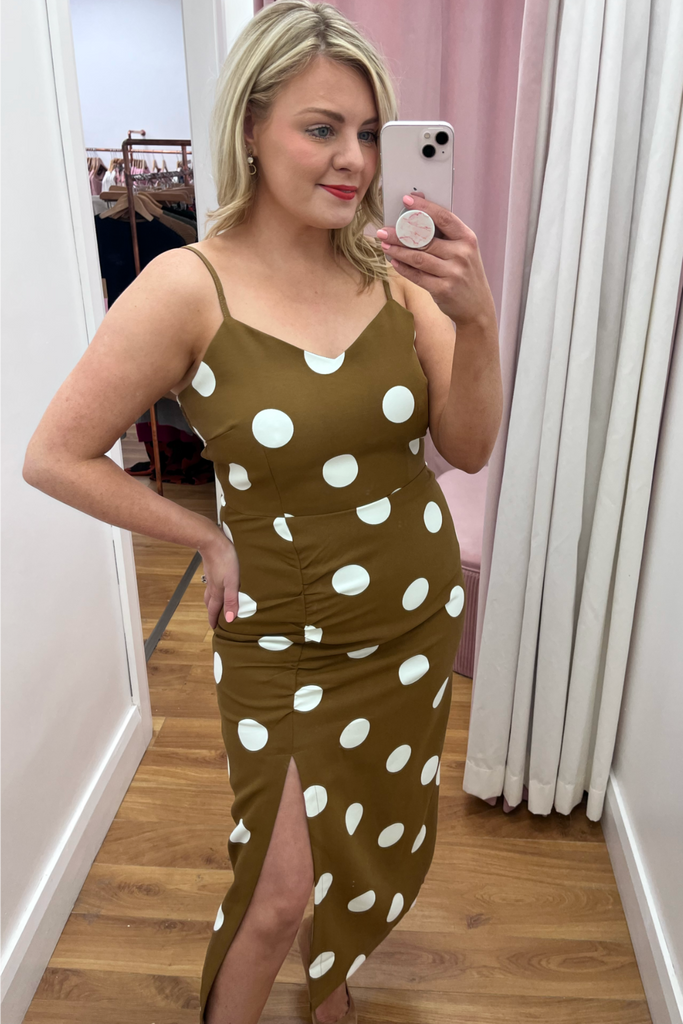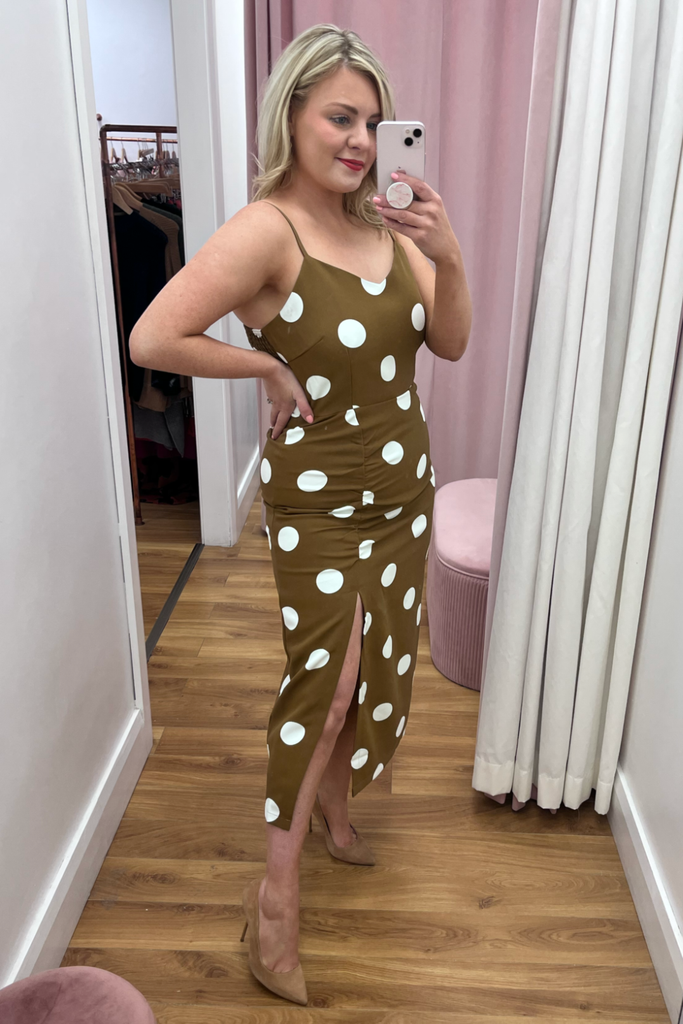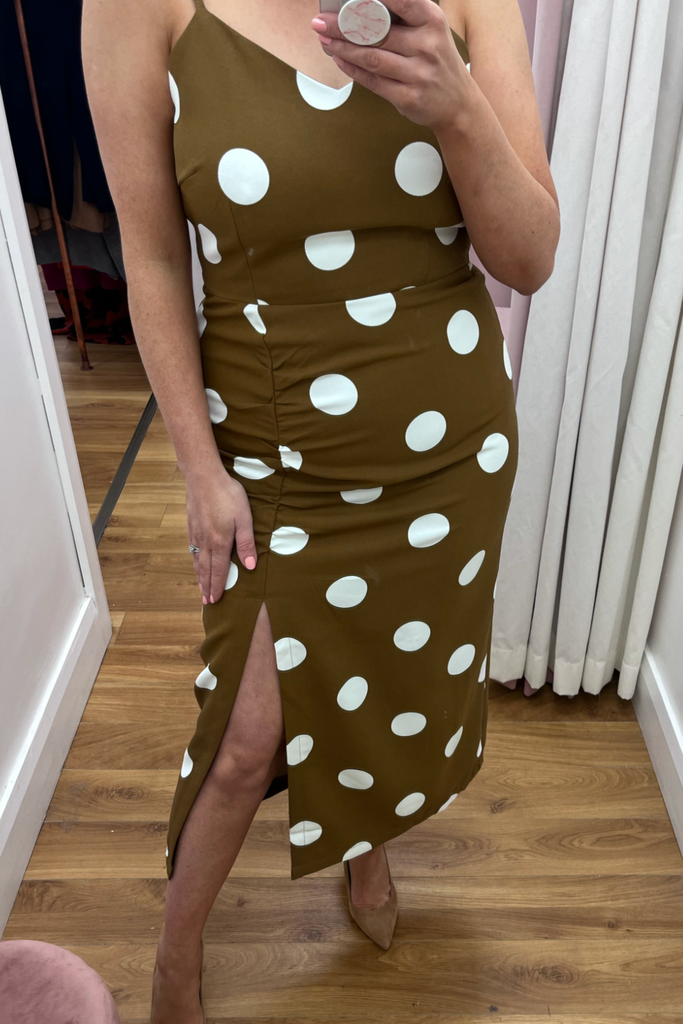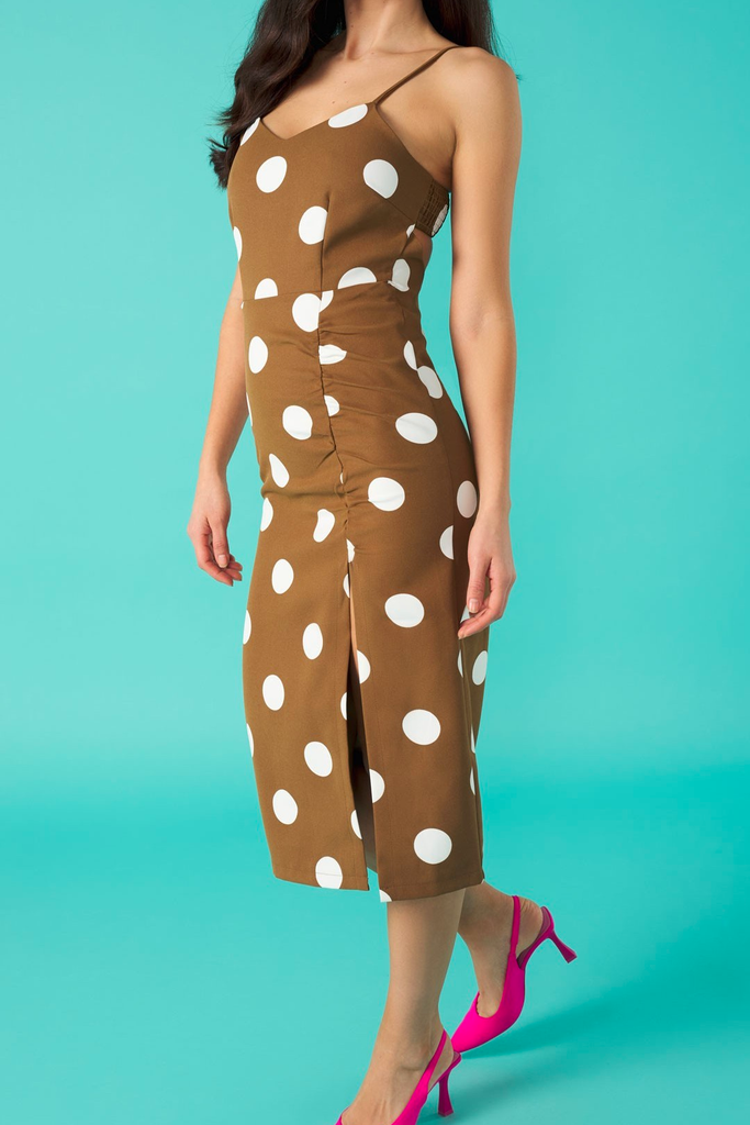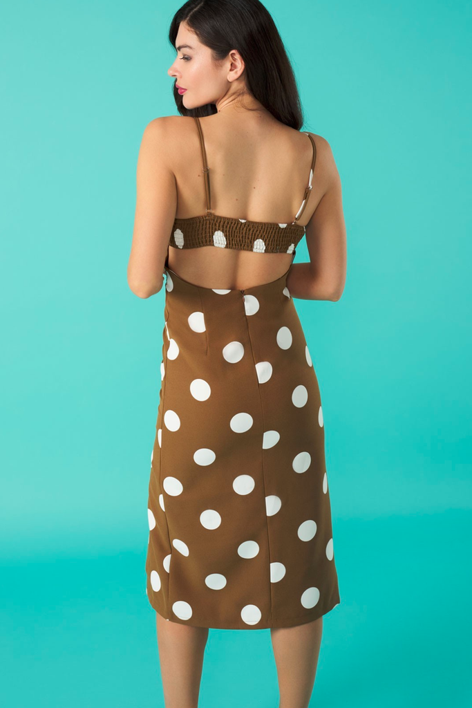 A rich brown midi with large white polka dot print. It features a gathered tummy area, fitted waist, V-neckline and side leg slit. This style has a fabulous back cut out and sculpted shape.