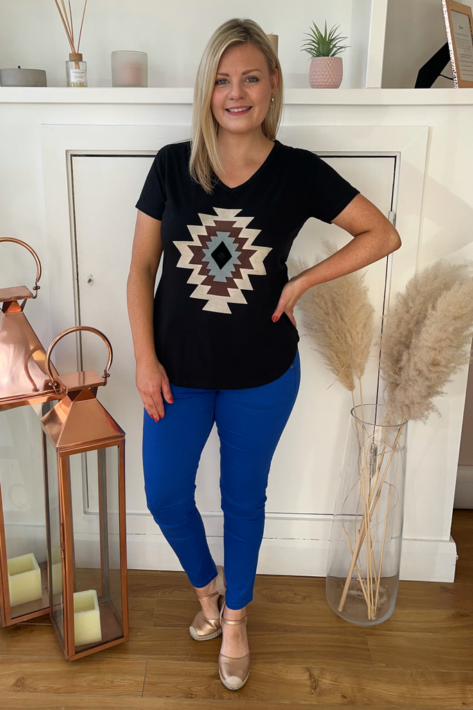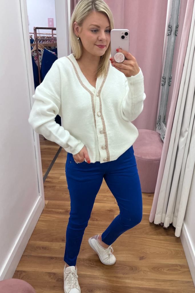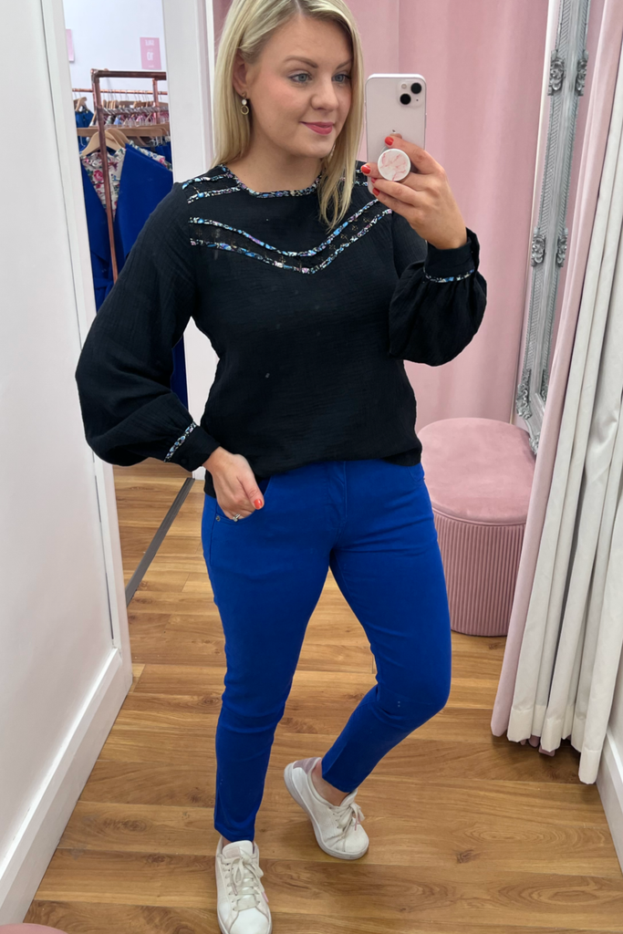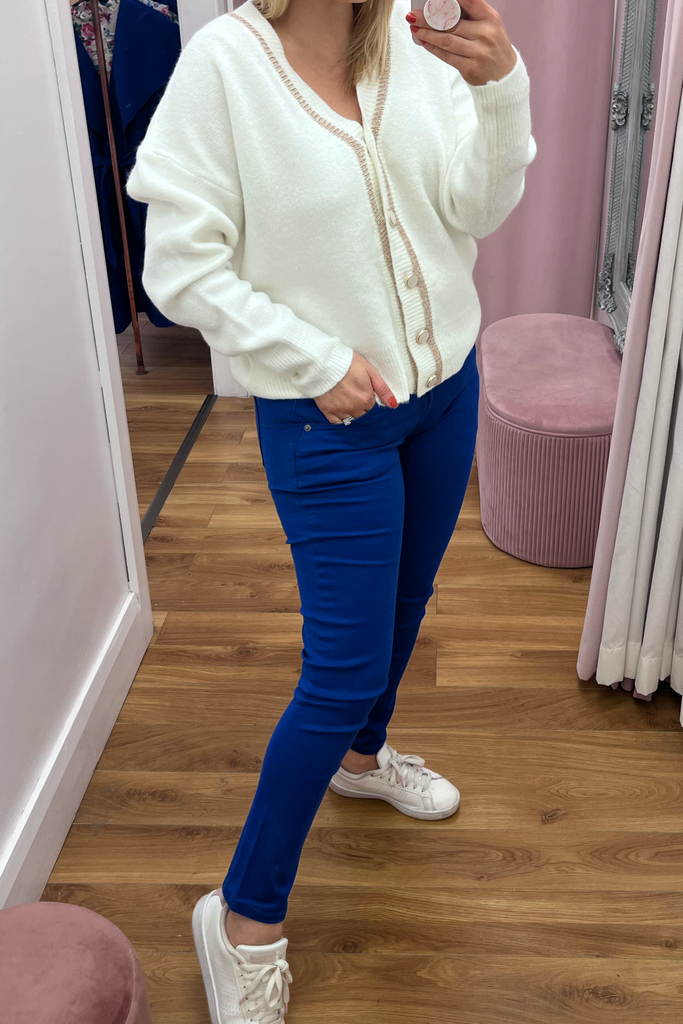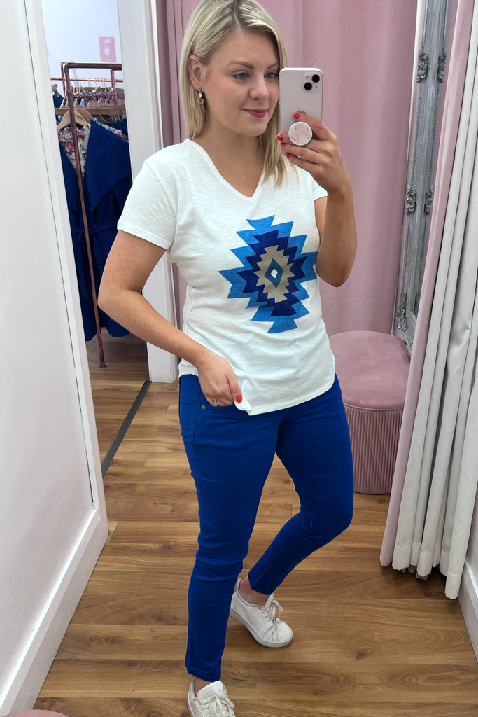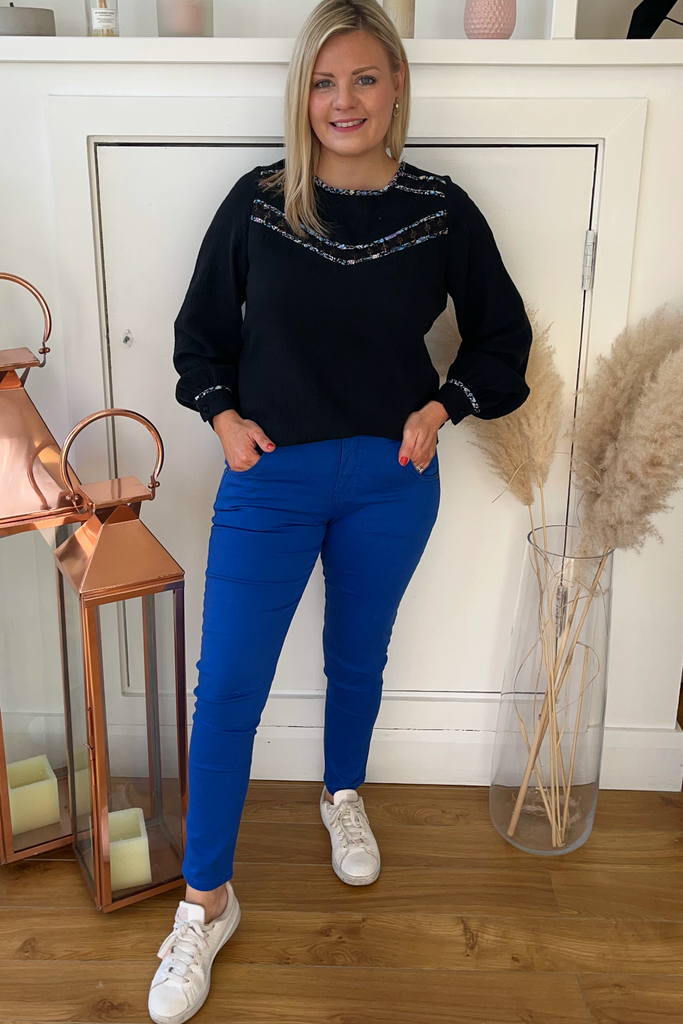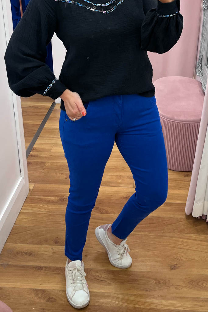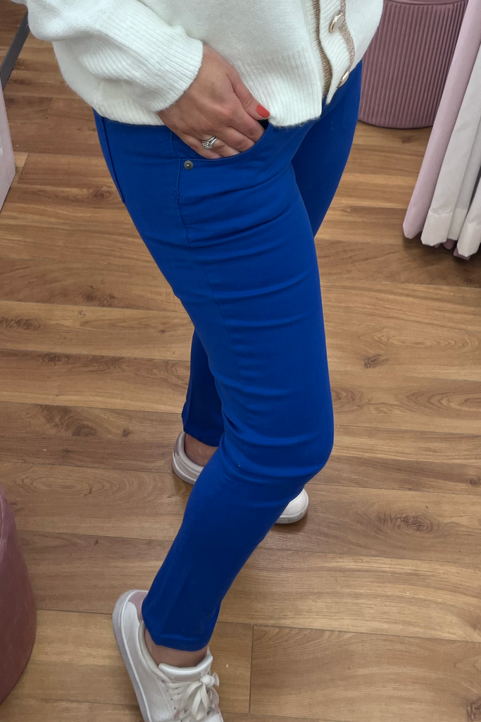 A rich blue colour denim style trouser in an ankle length with front and back pockets, and single button. This style has a little stretch. Perfect with a tee and trainer, or blouse and wedges!