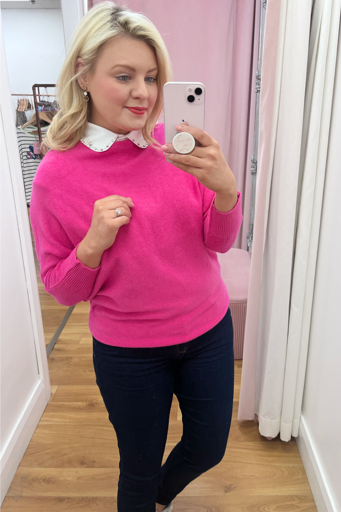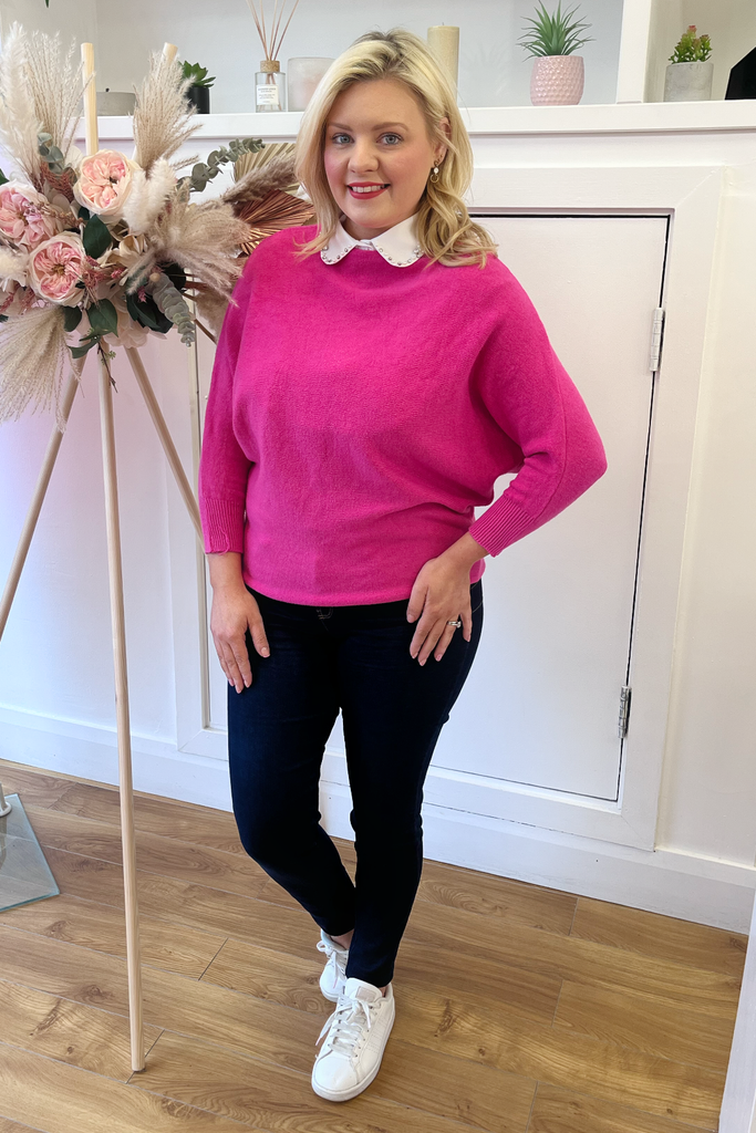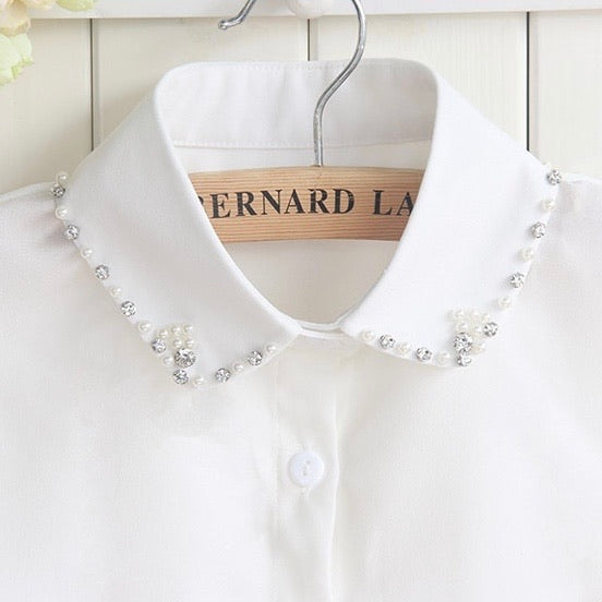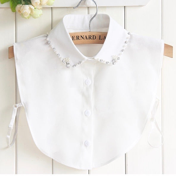 White collar bib featuring delicate pearl and diamanté embellishment along the collar. The collar is gently rounded. The perfect accessory for under any jumper