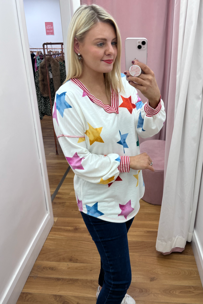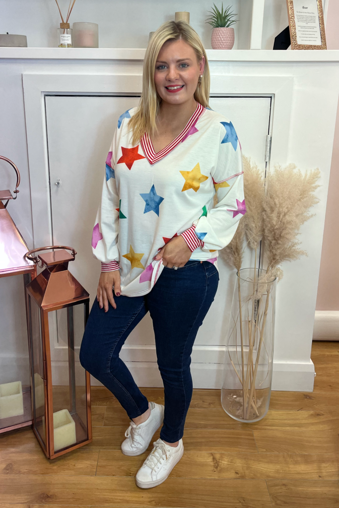 Ivory V-neck top with multi-coloured star print and contrasting striped detail on the neckline and cuffs. It features a dipped hem to the front and back with great length.