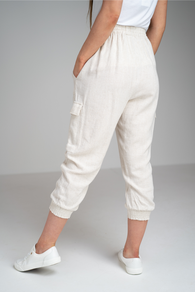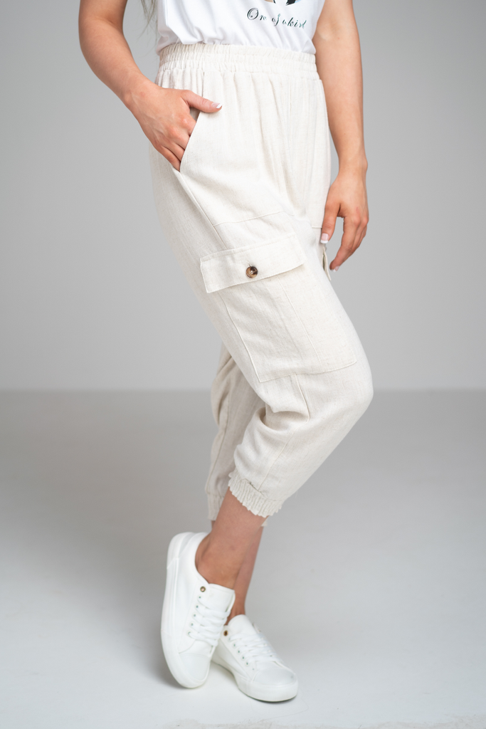 Cropped length with an elasticated waistband for comfort. They have side pockets along with pockets on the side of each log which fasten with a button.