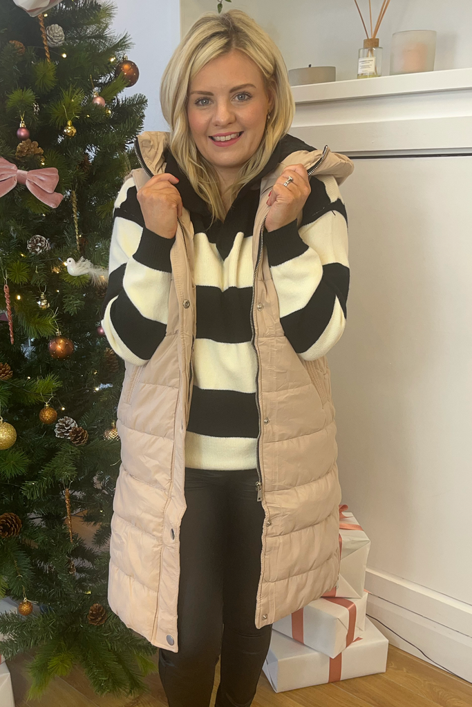 A wardrobe must have! Our longline puffer gilet is sure to keep you cosy! Featuring a zip up front with snap button closure, oversized hood and side pockets. Contrasting zip detailing on both sides for an extra bit of detail and also allows for adjustable coverage. Gilets are perfect for layering and are super versatile!