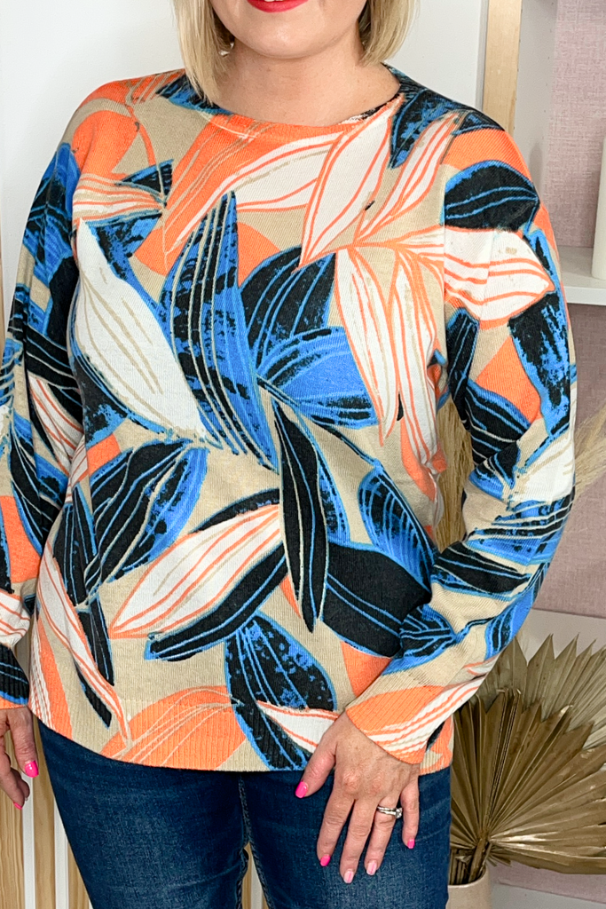 Longer line jumper with dipped hem to the back. In a vibrant mix of blues and orange